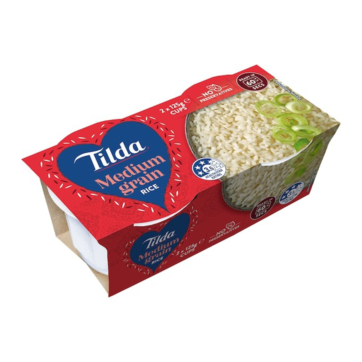 Tilda Medium Grain Rice Cups x2 250g: Convenient, delicious, and ready in minutes. Perfect for quick meals at home or on-the-go. Enjoy premium quality rice anytime, anywhere.