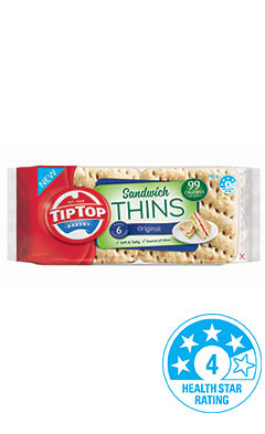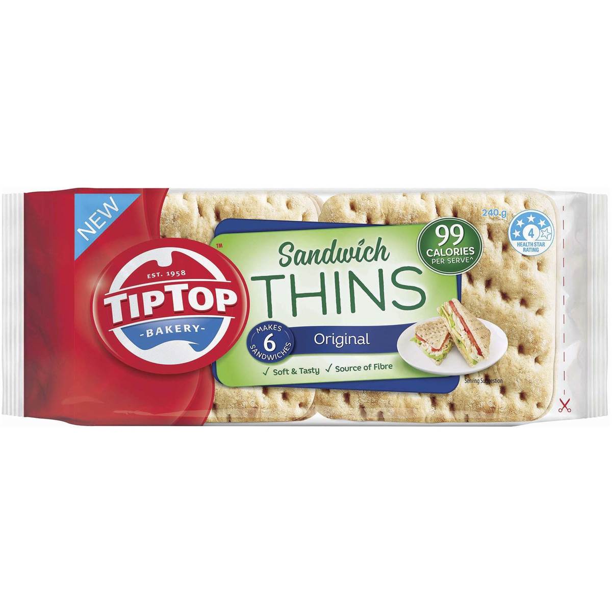 Tip Top Sandwich Thins Original x6 240g are the perfect choice for a delicious and lighter sandwich option. With only 99 calories per thin, these sandwich thins are a great way to enjoy your favorite fillings without the guilt. Made with high-quality ingredients, they are a source of fiber and are low in fat. Upgrade your sandwich game with Tip Top Sandwich Thins Original x6 240g today!