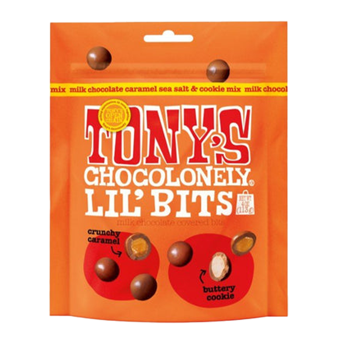 Indulge in Tony's Chocolonely Lil Bits Caramel Sea Salt & Cookie Mix for a delectable blend of sweet caramel, savory sea salt, and crunchy cookie bits. Satisfy your cravings with this 113g pack of pure chocolate bliss.