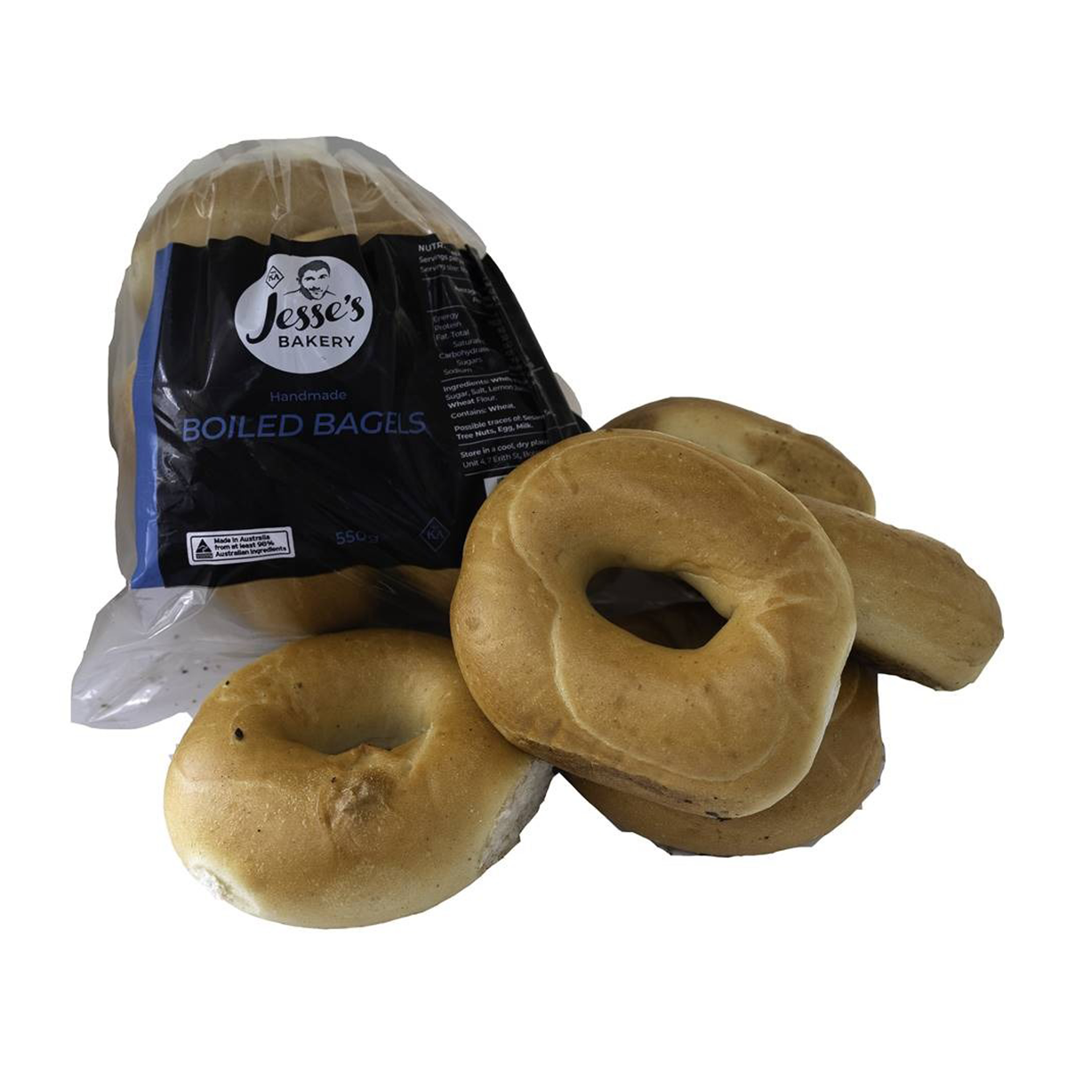 Jesse's Boiled Bagels Plain 550g: Enjoy freshly baked, chewy bagels at home with our convenient pack. Made with premium ingredients, these bagels are perfect for a quick and delicious breakfast or snack. Order now for a tasty treat that will satisfy your cravings!