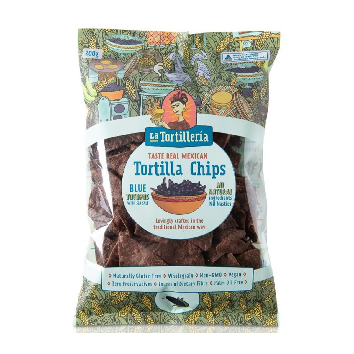 La Tortilleria Blue Corn Totopos 200g: Authentic Mexican blue corn chips bursting with flavor. Perfect for snacking, dipping, or adding a crunchy twist to your favorite dishes. Elevate your meals with these gluten-free, non-GMO totopos made with love and tradition.