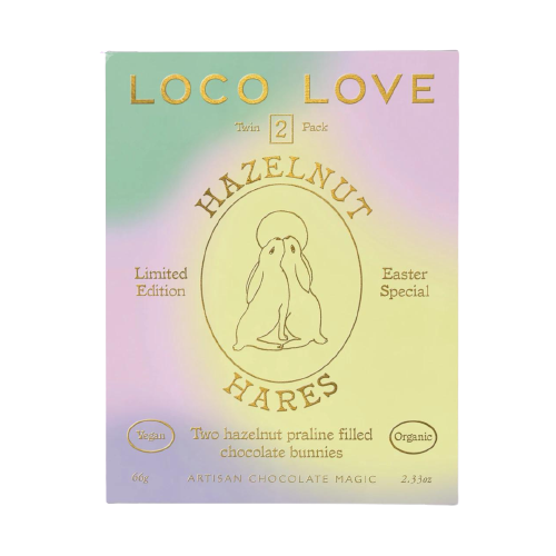 Indulge in the rich and decadent flavor of Loco Love Hazelnut Hares. These 66g chocolate treats are a perfect blend of smooth hazelnut and creamy chocolate, creating a heavenly taste experience. Satisfy your sweet cravings with these organic, vegan, and gluten-free delights. Perfect for a guilt-free indulgence or as a thoughtful gift for someone special.