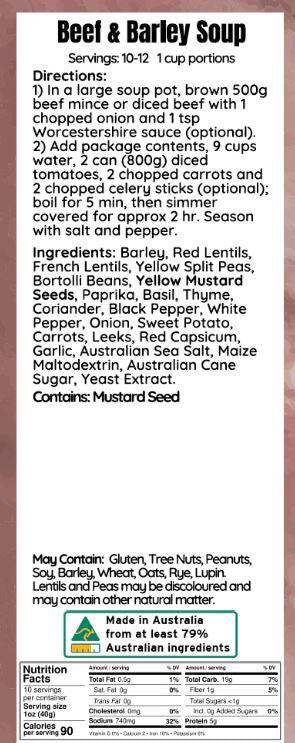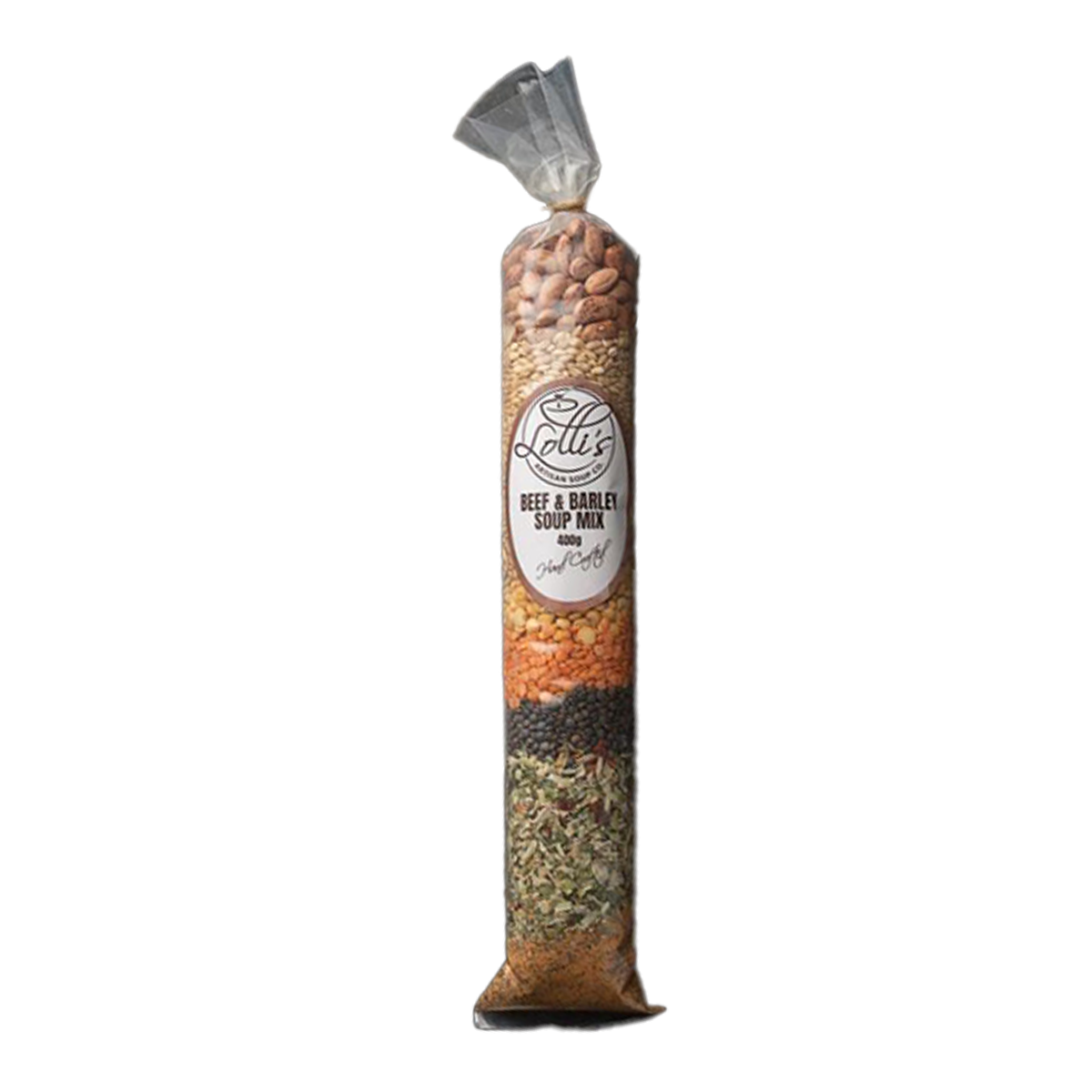 Lolli's Artisan Beef and Barley Soup Mix 400g: Indulge in a hearty and flavorful meal with our premium soup mix. Packed with tender beef and wholesome barley, this easy-to-make soup is the perfect comfort food for any occasion. Elevate your dining experience with Lolli's Artisan Beef and Barley Soup Mix today!