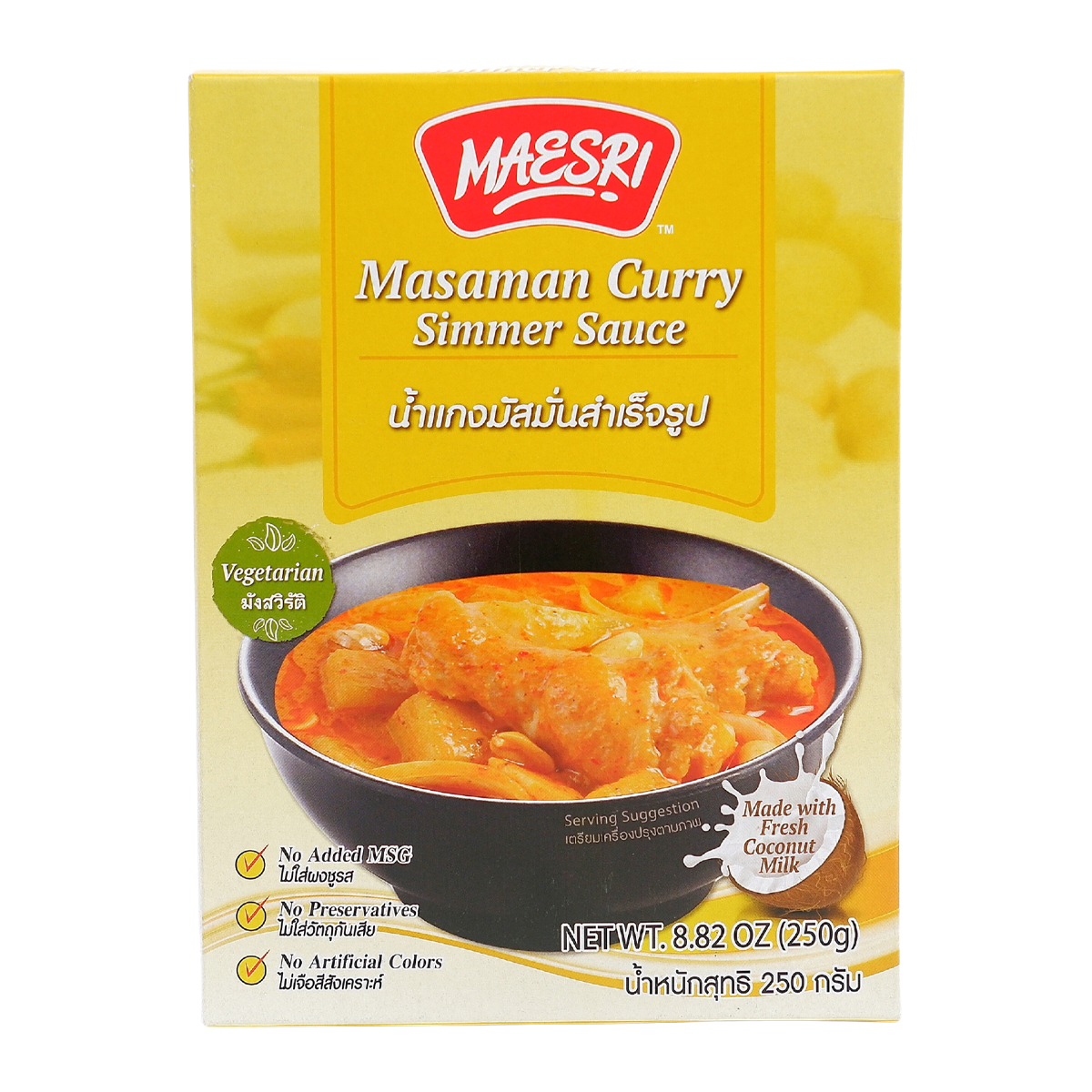 Maesri Masaman Curry Simmer Sauce 250g: Elevate your meals with this authentic Thai curry sauce. Made with a blend of aromatic spices and rich coconut milk, it's the perfect way to add a burst of flavor to your dishes. Simply simmer with your choice of protein and vegetables for a delicious and convenient meal in minutes. Experience the taste of Thailand in every bite with Maesri Masaman Curry Simmer Sauce.