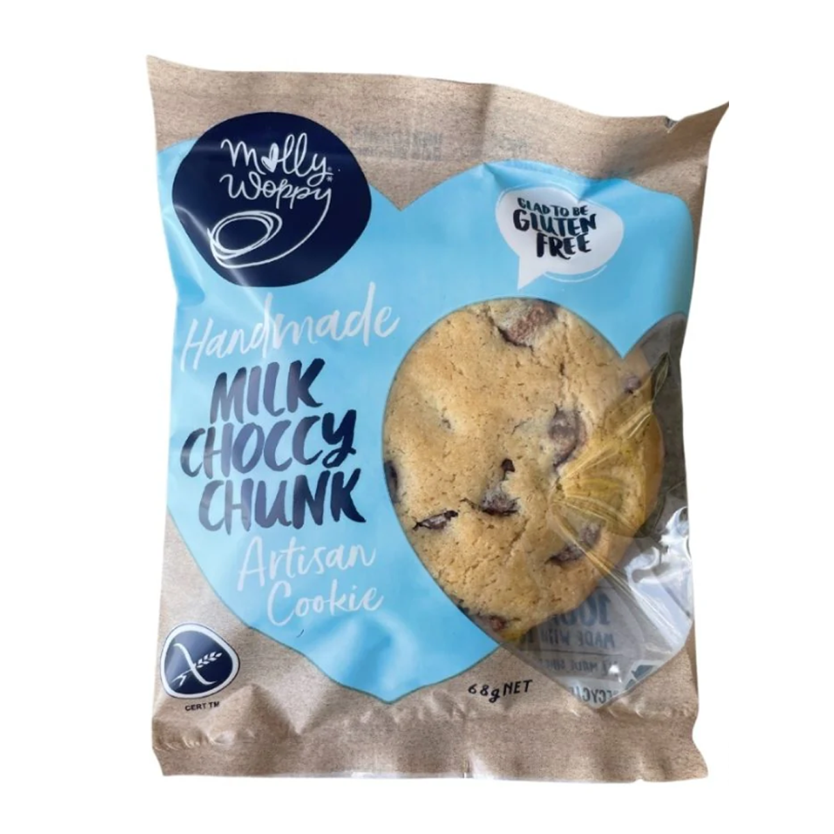 Indulge in the rich and decadent taste of our Molly Woppy Grab'n'Go Milk Choccy Chunk cookies. Perfect for satisfying your sweet cravings on the move. Enjoy the convenience of a 68g pack filled with delicious chunks of milk chocolate in every bite. Treat yourself to a delightful snack that's sure to brighten your day.