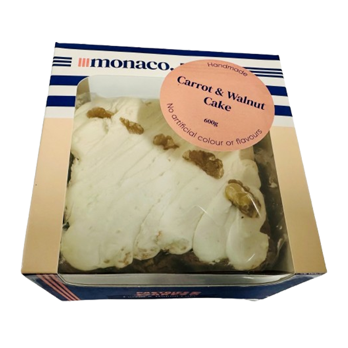 Indulge in the rich flavors of our Monaco Carrot & Walnut Cake 600g. Made with premium ingredients, this moist and decadent cake is the perfect treat for any occasion. Enjoy the perfect balance of sweet carrots and crunchy walnuts in every bite. Order now and elevate your dessert experience!