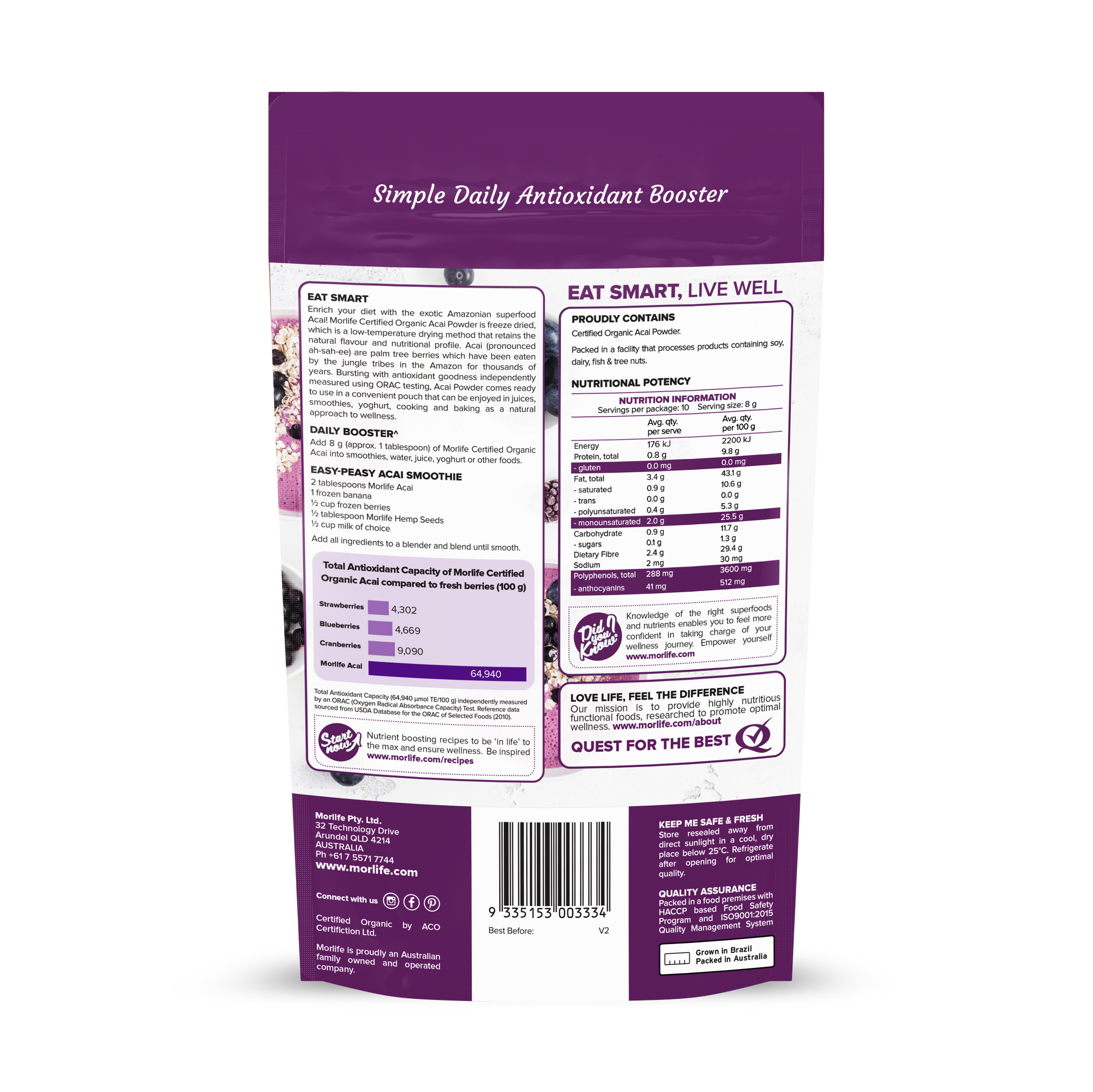 Morlife Organic Freeze Dried Acai Powder 80g is a powerhouse of antioxidants and nutrients, perfect for boosting your immune system and promoting overall health. Packed with organic goodness, this powder is a convenient way to add acai to your daily routine. Enjoy the benefits of this superfood in smoothies, yogurt, or baked goods. Energize your body and support your well-being with Morlife Organic Freeze Dried Acai Powder 80g.