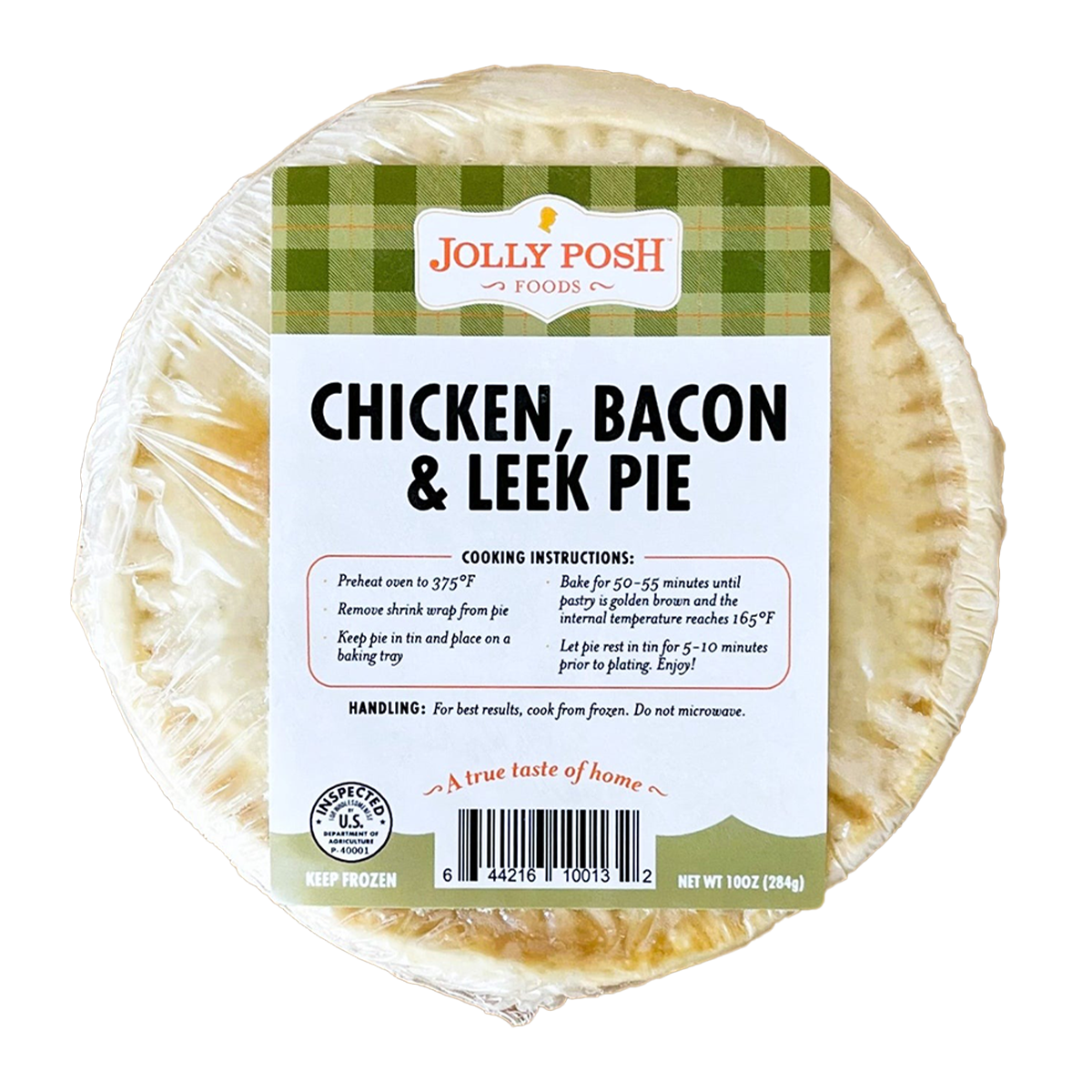 Posh Chicken, Bacon & Leek Pie 270g: Indulge in a savory blend of tender chicken, crispy bacon, and flavorful leeks encased in buttery pastry. Perfect for a quick and delicious meal, this gourmet pie is sure to satisfy your cravings. Enjoy convenience without compromising on taste with our Posh Chicken, Bacon & Leek Pie.