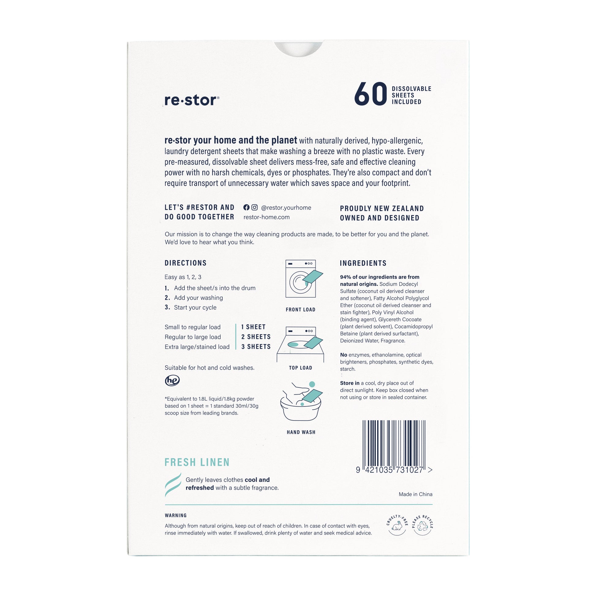 Restor Concentrated Laundry Detergent Sheets in Fresh Linen scent offer powerful cleaning in a convenient, mess-free sheet. With 60 sheets per pack, these eco-friendly and travel-friendly detergent sheets dissolve easily in all water temperatures, leaving your clothes fresh and clean. Say goodbye to bulky detergent bottles and hello to a simpler, more effective laundry routine with Restor Detergent Sheets.