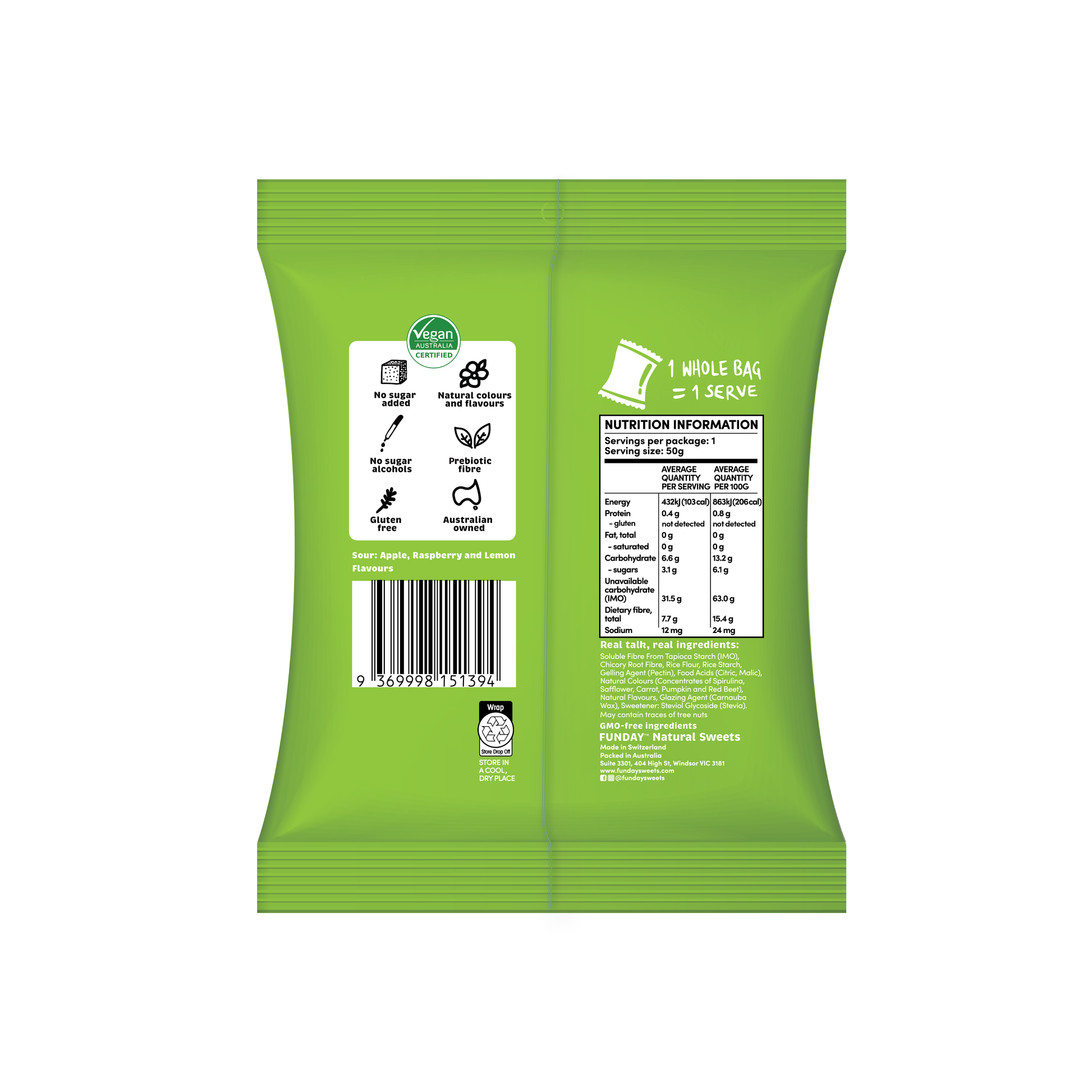 Indulge in guilt-free snacking with Funday Sour Vegan Gummy Bears 50g. Bursting with fruity flavors and free from animal products, these gummy bears are the perfect treat for vegans and non-vegans alike. Enjoy a sour kick with every bite and satisfy your sweet cravings with these delicious and cruelty-free gummy bears.