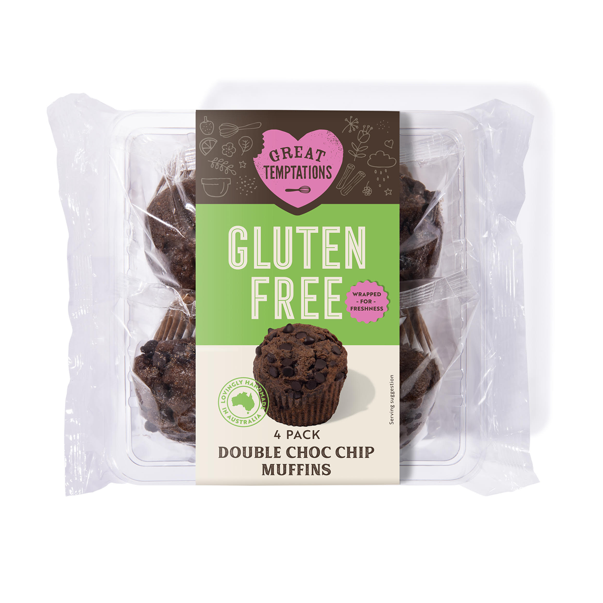 Indulge guilt-free with Great Temptations Double Choc Chip Gluten Free Muffins. Enjoy the rich, chocolatey goodness in every bite. Perfect for gluten-sensitive individuals. Get your hands on a pack of 4 delicious muffins today!