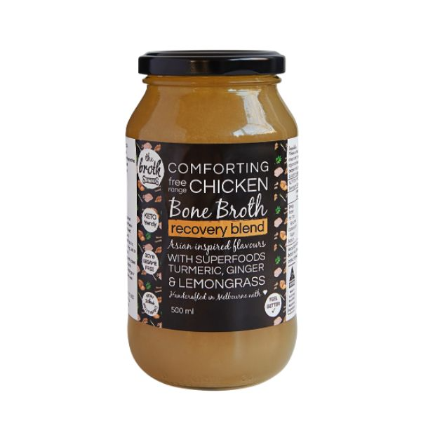 The Broth Sisters Chicken Bone Broth with Turmeric, Ginger, and Lemongrass 500ml: Boost your immunity and soothe your soul with this flavorful blend of nourishing ingredients. Packed with anti-inflammatory properties, this golden elixir is the perfect way to support your health and well-being.