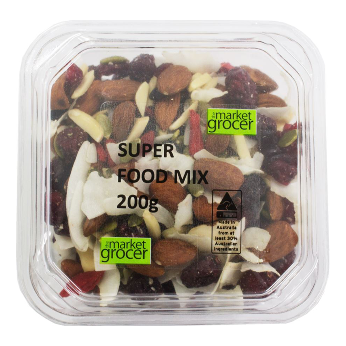 The Market Grocer Super Food Mix 200g: Boost your health with our nutrient-packed blend of superfoods. Packed with antioxidants, vitamins, and minerals to support your overall well-being. Perfect for adding a nutritious kick to smoothies, yogurt, or baked goods. Shop now for a convenient way to supercharge your diet!