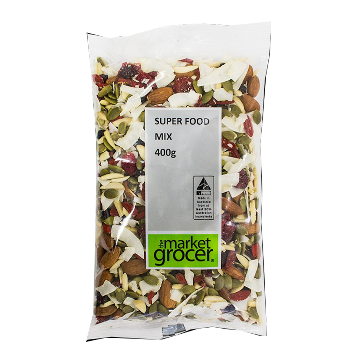 The Market Grocer Superfood Mix 400g is a nutrient-packed blend designed to boost your health and energy levels. Packed with antioxidants, vitamins, and minerals, this superfood mix supports overall well-being and vitality. Add a spoonful to your smoothies, yogurt, or baked goods for a delicious and nutritious boost. Elevate your daily meals with The Market Grocer Superfood Mix 400g and feel the difference in your health and energy!