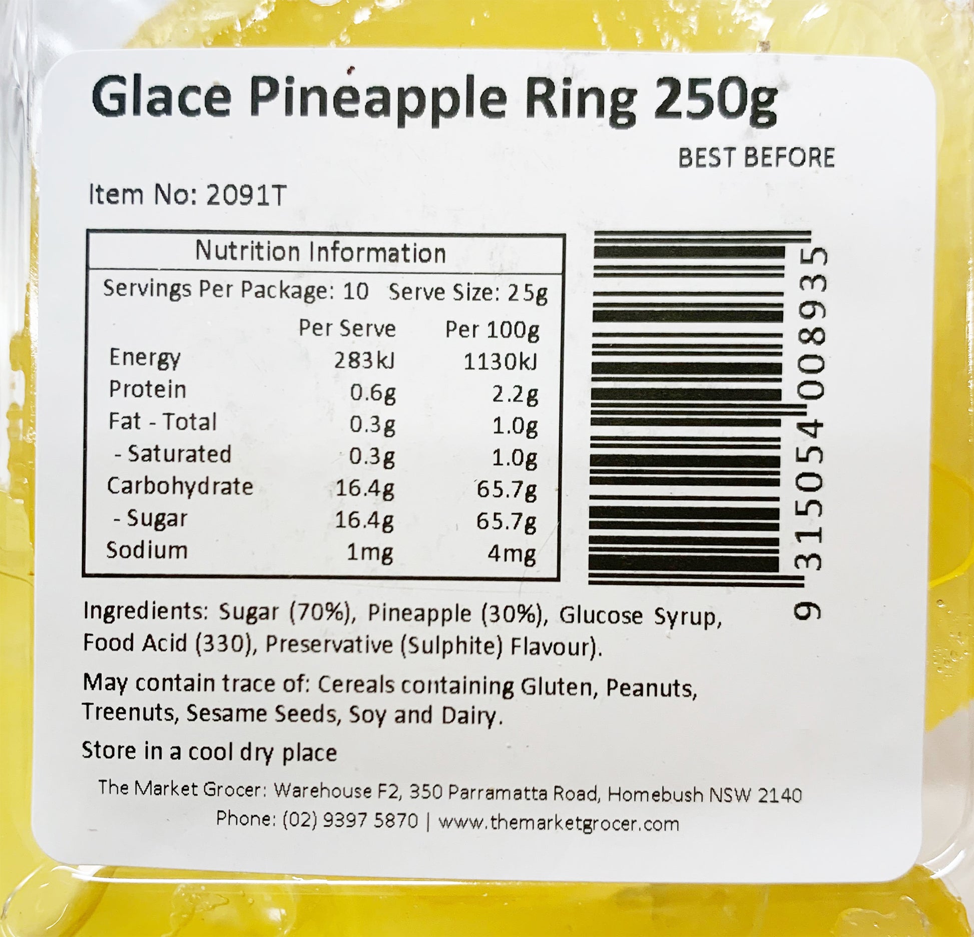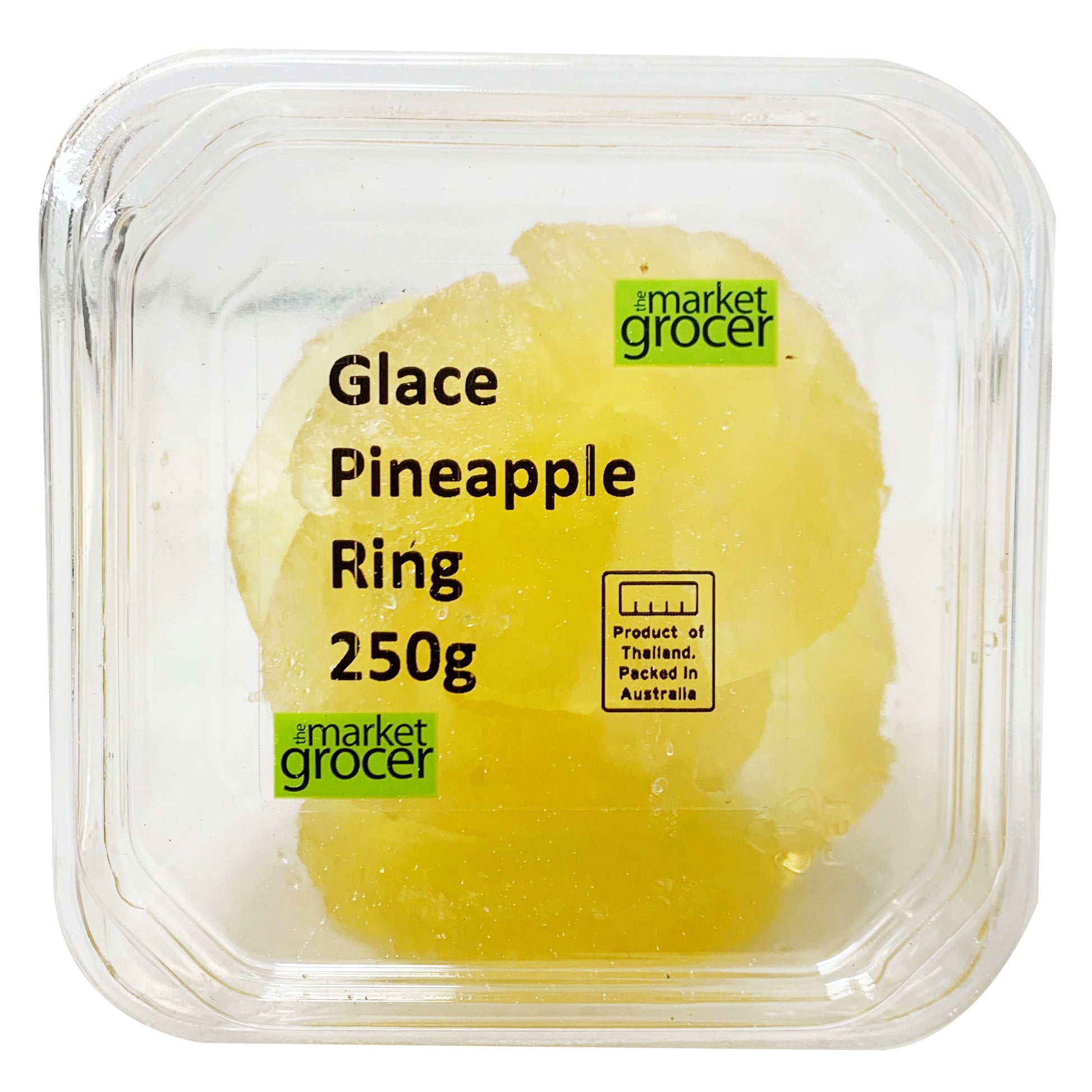 Indulge in The Market Grocer Glace Pineapple Rings 250g for a sweet and tropical treat. Perfect for snacking, baking, or adding a burst of flavor to your dishes. Elevate your culinary creations with these premium quality glace pineapple rings.