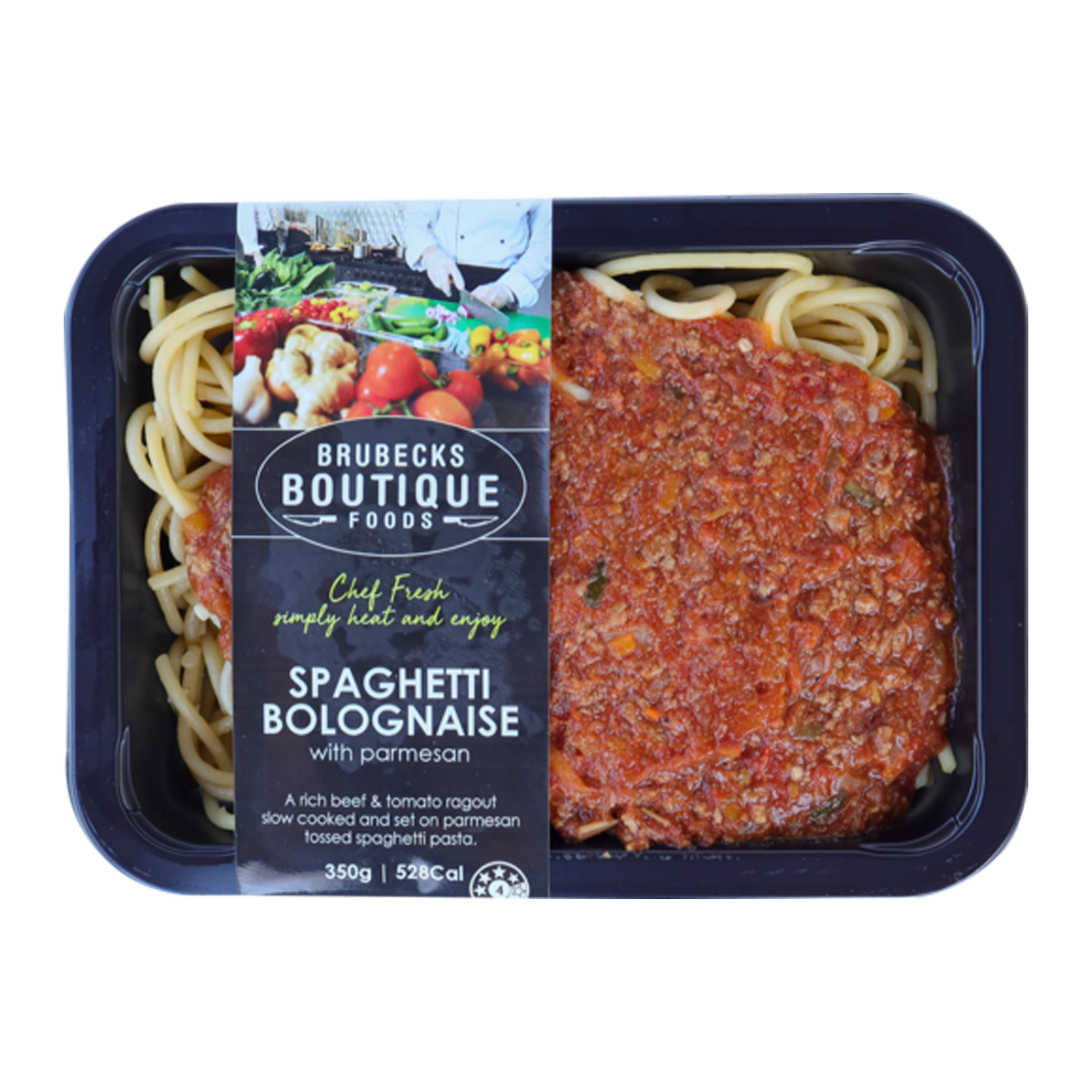 Delicious Brubecks Boutique Foods Spaghetti Bolognese 350g: A gourmet meal ready in minutes. Made with premium ingredients for a rich, authentic taste. Perfect for busy foodies craving a quick, satisfying dinner. Enjoy restaurant-quality pasta at home with our convenient, flavorful recipe.
