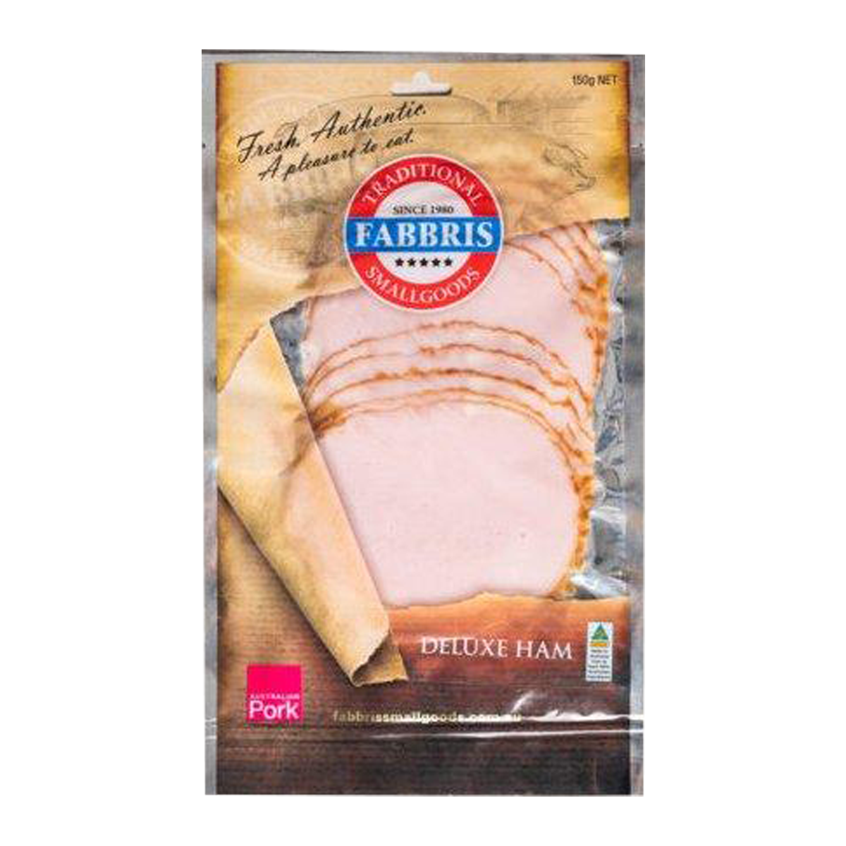 Fabbris Ham Deluxe Sliced 150g offers premium quality and convenience in every bite. Indulge in perfectly sliced, flavorful ham that elevates any dish. Ideal for quick meals, sandwiches, or charcuterie boards. Upgrade your culinary experience with Fabbris Ham Deluxe Sliced 150g.