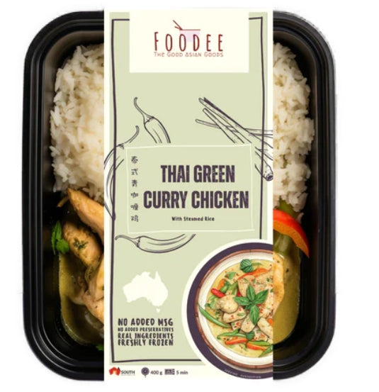 Foodee Thai Green Curry Chicken 450g: Indulge in a flavorful blend of tender chicken, aromatic herbs, and creamy coconut milk with our authentic Thai Green Curry. Ready in minutes, this convenient meal is perfect for satisfying your cravings for a delicious and exotic dish. Enjoy a taste of Thailand in the comfort of your own home with Foodee Thai Green Curry Chicken.