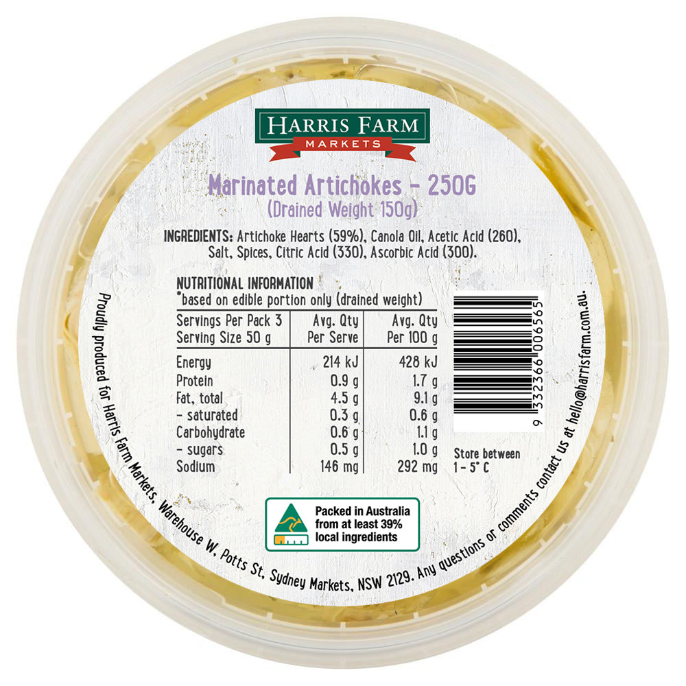 Enjoy the rich, smoky flavor of Harris Farm Artichoke Grilled 250g. Perfect for adding a gourmet touch to your dishes. Elevate your meals with these tender and flavorful grilled artichokes.