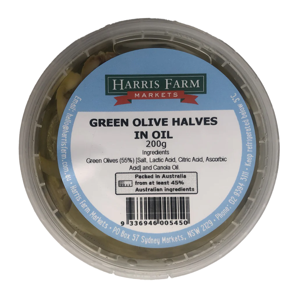 Harris Farm Green Olive Halves In Oil 200g: Elevate your dishes with premium quality green olives, perfectly halved and preserved in rich oil. Add a burst of Mediterranean flavor to your meals effortlessly. Ideal for salads, pasta, and antipasto platters. Shop now for a taste of gourmet indulgence.