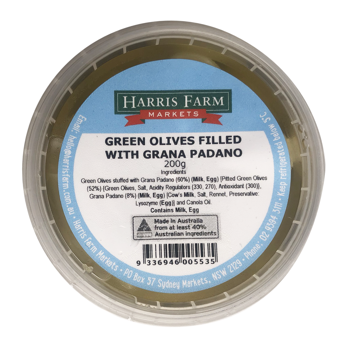 Harris Farm Green Olive with Grana Padano 200g: Indulge in the perfect blend of savory green olives and rich Grana Padano cheese. Elevate your snacking experience with this gourmet treat.