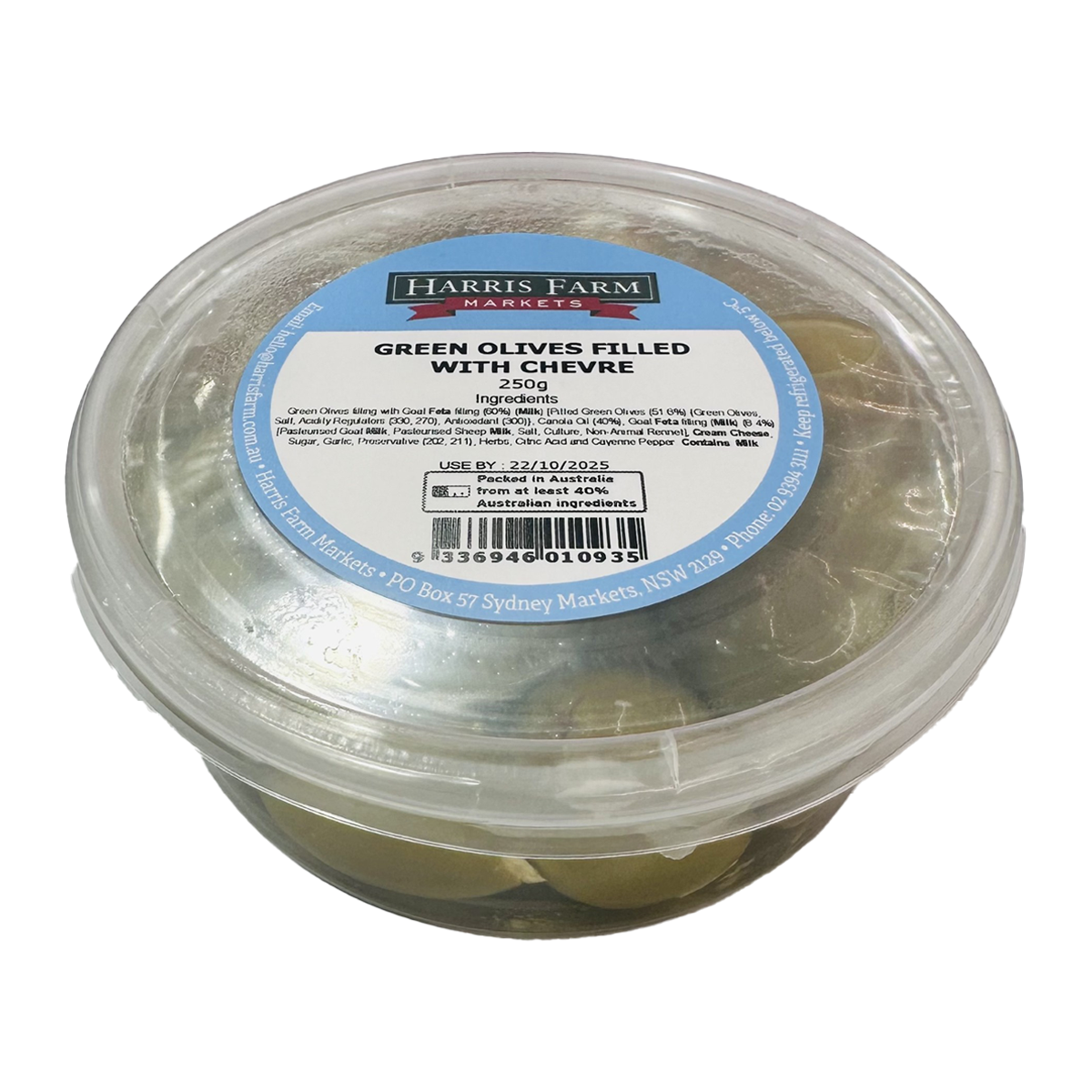 Indulge in the perfect blend of tangy green olives and creamy Chevre cheese with Harris Farm's 250g Green Olives with Chevre Cheese. Elevate your snacking experience with this irresistible combination of flavors. Perfect for entertaining or enjoying a gourmet treat on your own.