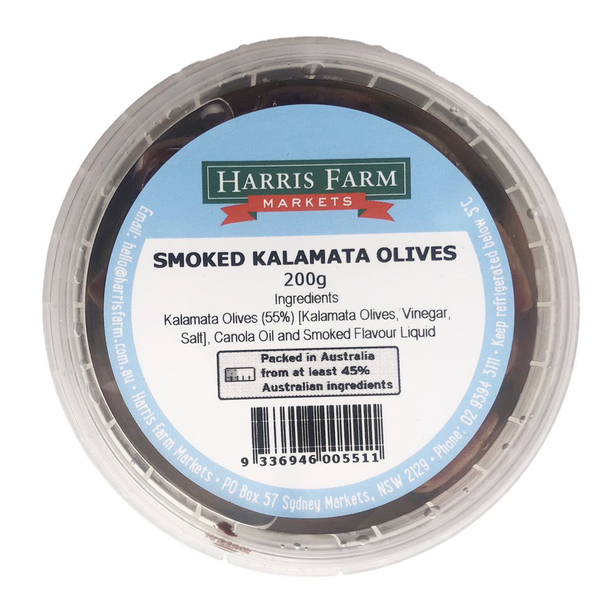 Harris Farm Smoked Kalamata Olives 200g: Indulge in rich, smoky flavor with our premium olives. Perfect for salads, charcuterie boards, or as a standalone snack. Elevate your culinary creations with these handpicked, gourmet olives.