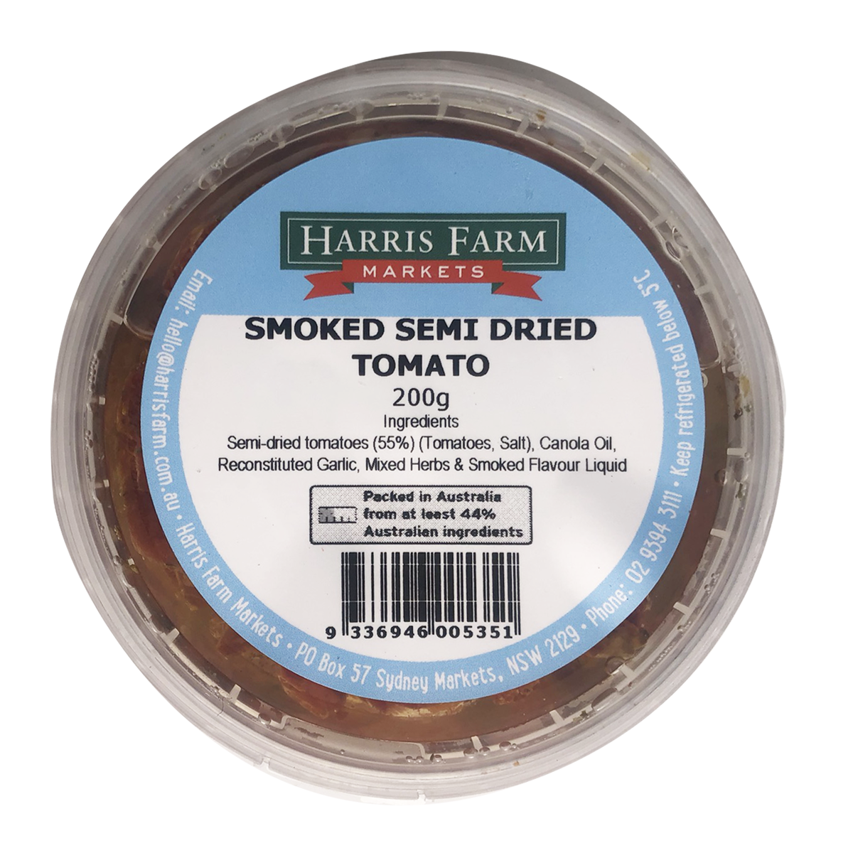 Harris Farm Smoked Semi Dried Tomato 200g: Elevate your dishes with the rich, smoky flavor of our premium semi-dried tomatoes. Packed with intense taste and nutrients, these tomatoes are a versatile addition to salads, pastas, and more. Experience gourmet quality in every bite with Harris Farm.