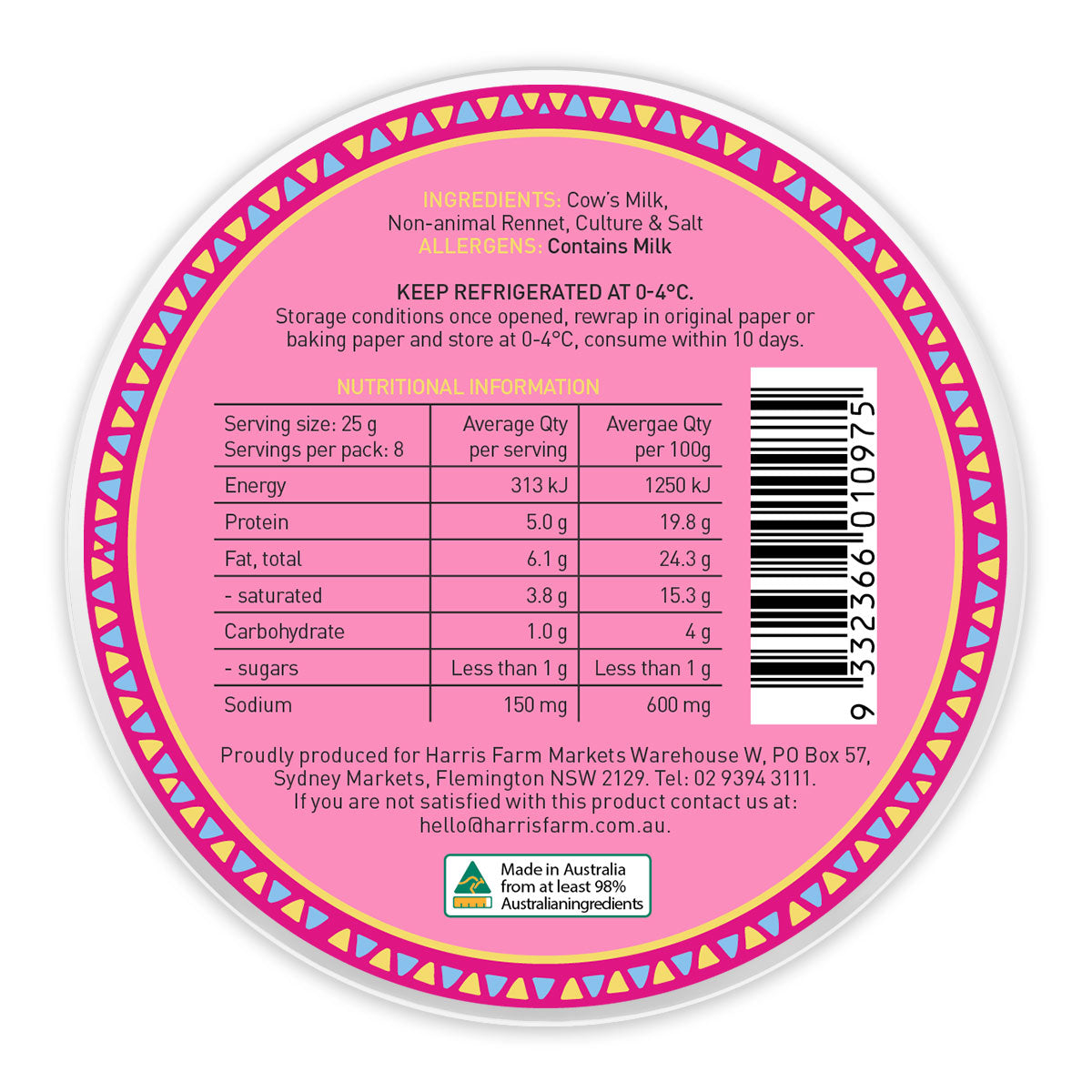 Indulge in the creamy richness of Harris Farm South Australian Brie 200g. Made with the finest ingredients, this brie cheese is a luxurious treat for your taste buds. Elevate your cheese platter or snack time with this exquisite delicacy. Enjoy the smooth texture and delicate flavor of this premium brie, perfect for any occasion. Order now to experience a taste of South Australia's finest.