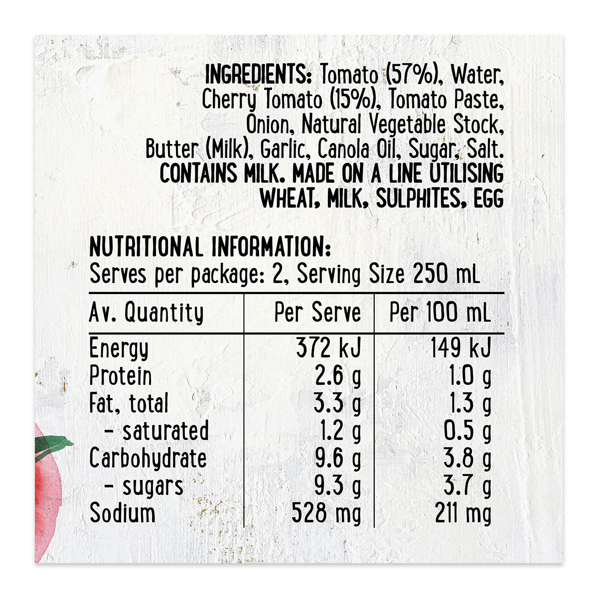 Harris Farm Soup Cheeky Cherry Tomato 500ml: Indulge in a burst of flavor with our rich and savory tomato soup. Made with premium cherry tomatoes, this soup is a delicious and convenient way to enjoy a hearty meal. Perfect for a quick and satisfying lunch or dinner option.