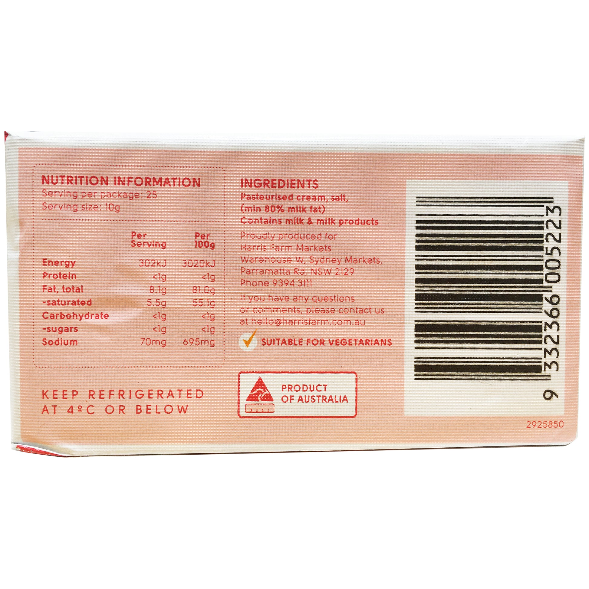 Harris Farm Butter Salted 250g: Elevate your dishes with our premium salted butter. Made from the finest ingredients, our butter adds rich flavor and creamy texture to your recipes. Perfect for baking, cooking, or spreading on toast. Upgrade your culinary creations with Harris Farm Butter Salted 250g.