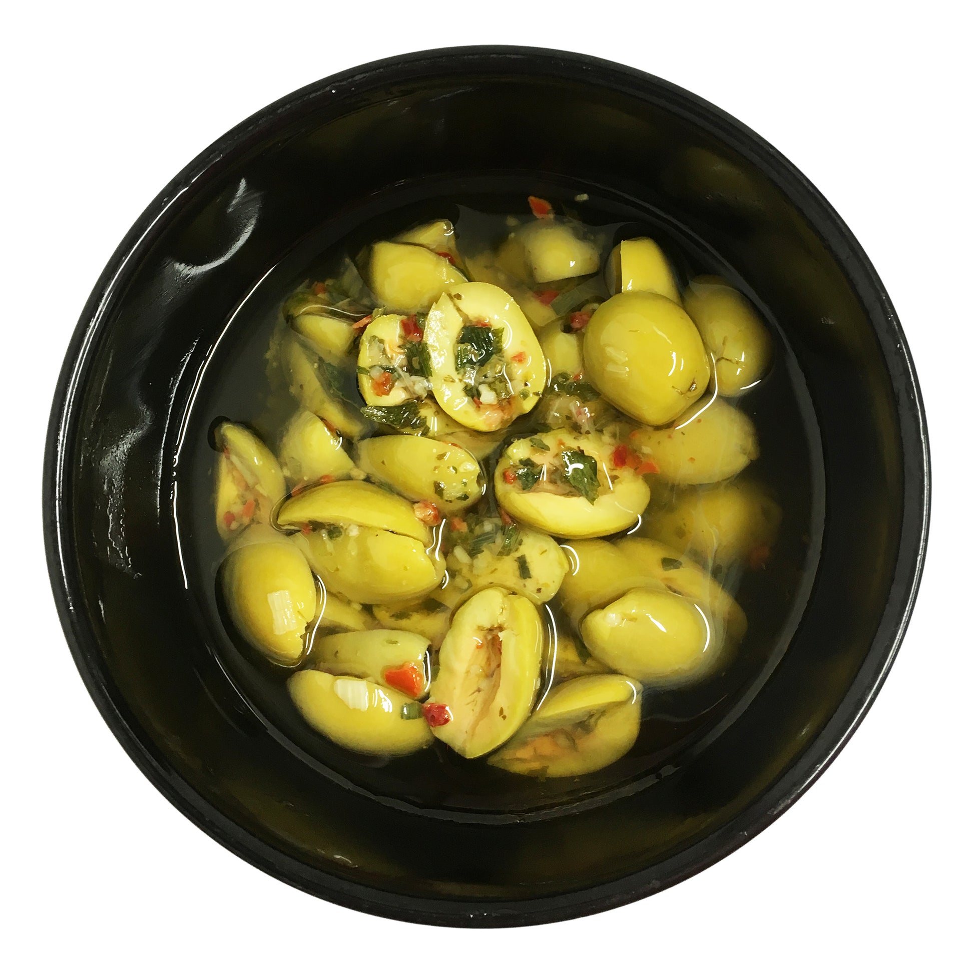 Harris Farm Olives Chilli Stuffed Green Split 250g: Enjoy bold flavors with a spicy kick in every bite. Perfect for snacking, salads, or antipasto platters. Elevate your meals with these premium quality olives.