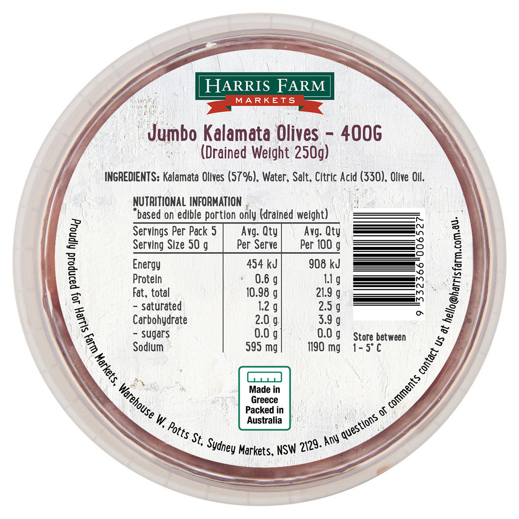 Harris Farm Olives Jumbo Kalamata 400g: Indulge in plump, flavorful olives bursting with Mediterranean goodness. Perfect for salads, pizzas, or snacking. Elevate your dishes with our premium, hand-picked olives.