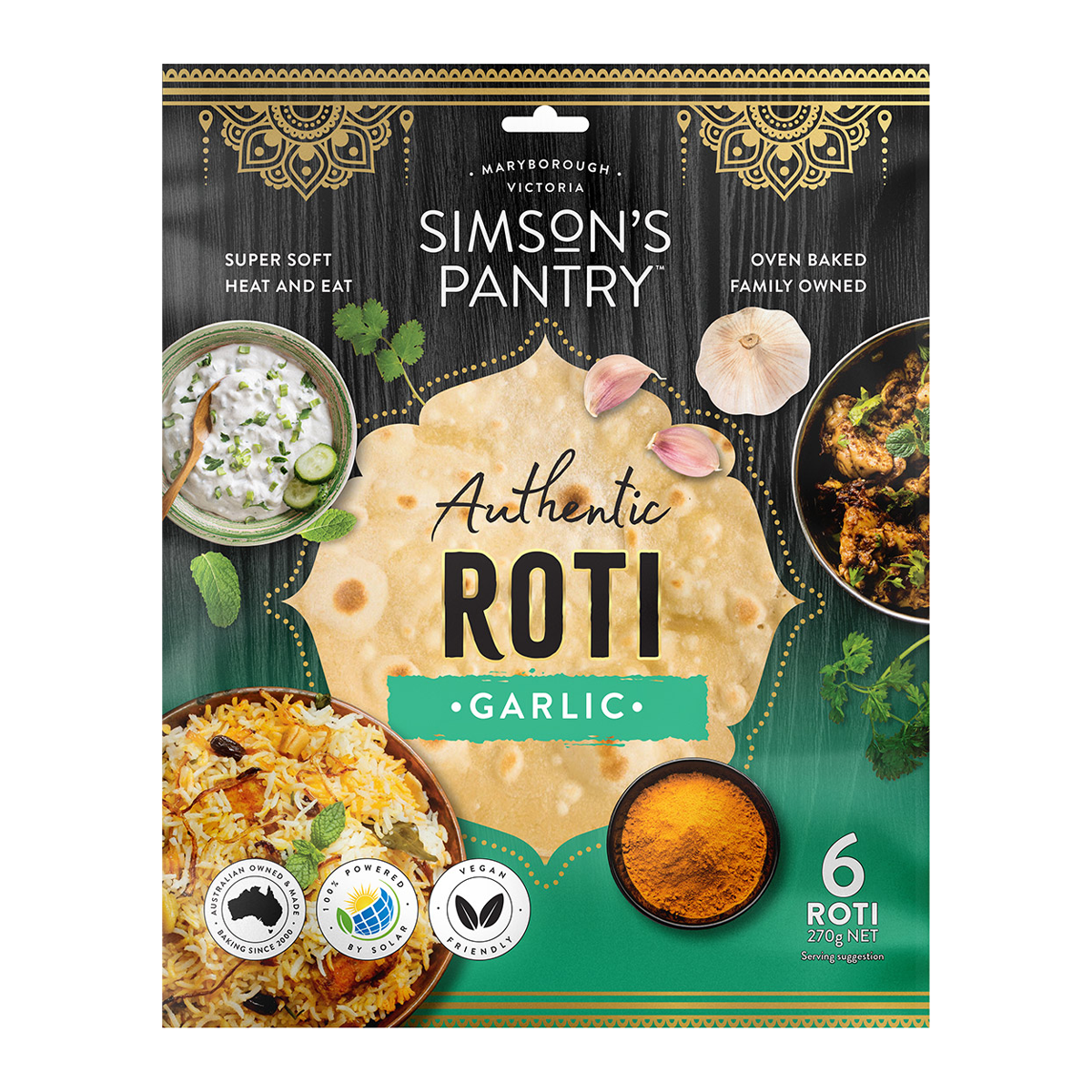 Simson's Pantry Roti Garlic 270g: Elevate your meals with our flavorful and aromatic garlic roti. Made with premium ingredients, our roti is perfect for quick and delicious meals. Enjoy the convenience and taste of Simson's Pantry Roti Garlic today!