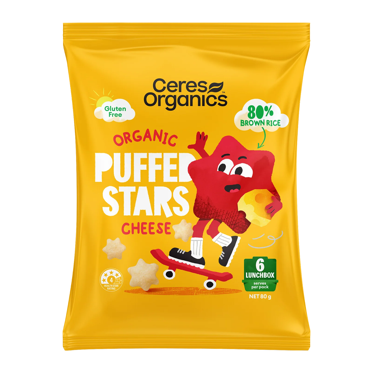Ceres Organics Puffed Stars Cheese 80g: Deliciously crunchy and organic cheese-flavored snacks that are perfect for guilt-free snacking. Enjoy the wholesome goodness of Ceres Organics in every bite!