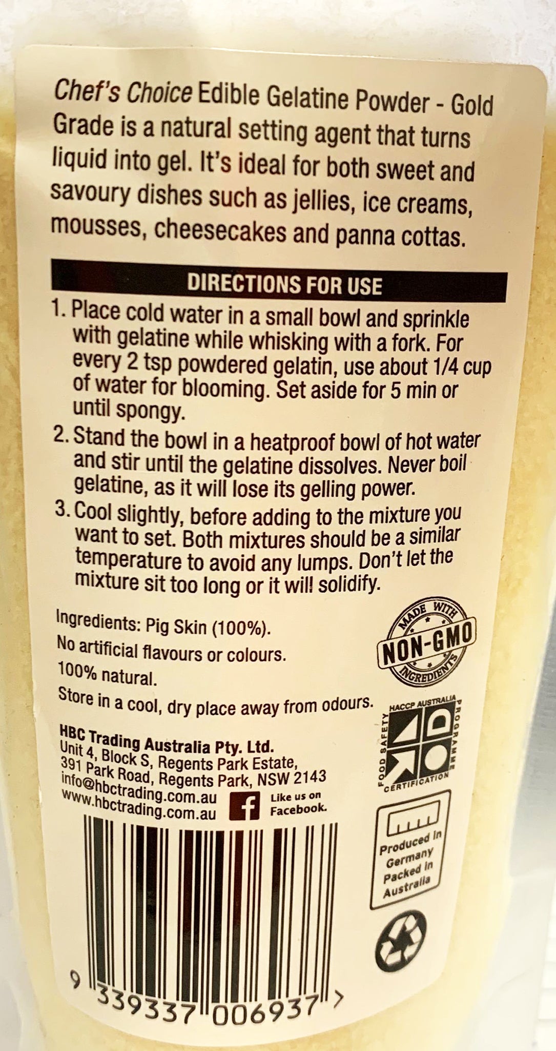 Chef's Choice Edible Gelatine Powder 150g is the secret ingredient to creating flawless desserts every time. This high-quality gelatine powder is easy to use and guarantees perfect results, making it a must-have for any aspiring or professional chef. Elevate your culinary creations with Chef's Choice Gelatine Powder today!