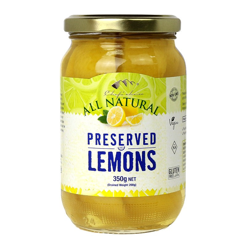 Enhance your culinary creations with Chef's Choice All Natural Preserved Lemons 350g. Made with premium ingredients, these preserved lemons add a burst of tangy flavor to your dishes. Elevate your cooking with this versatile ingredient that is sure to impress your taste buds.