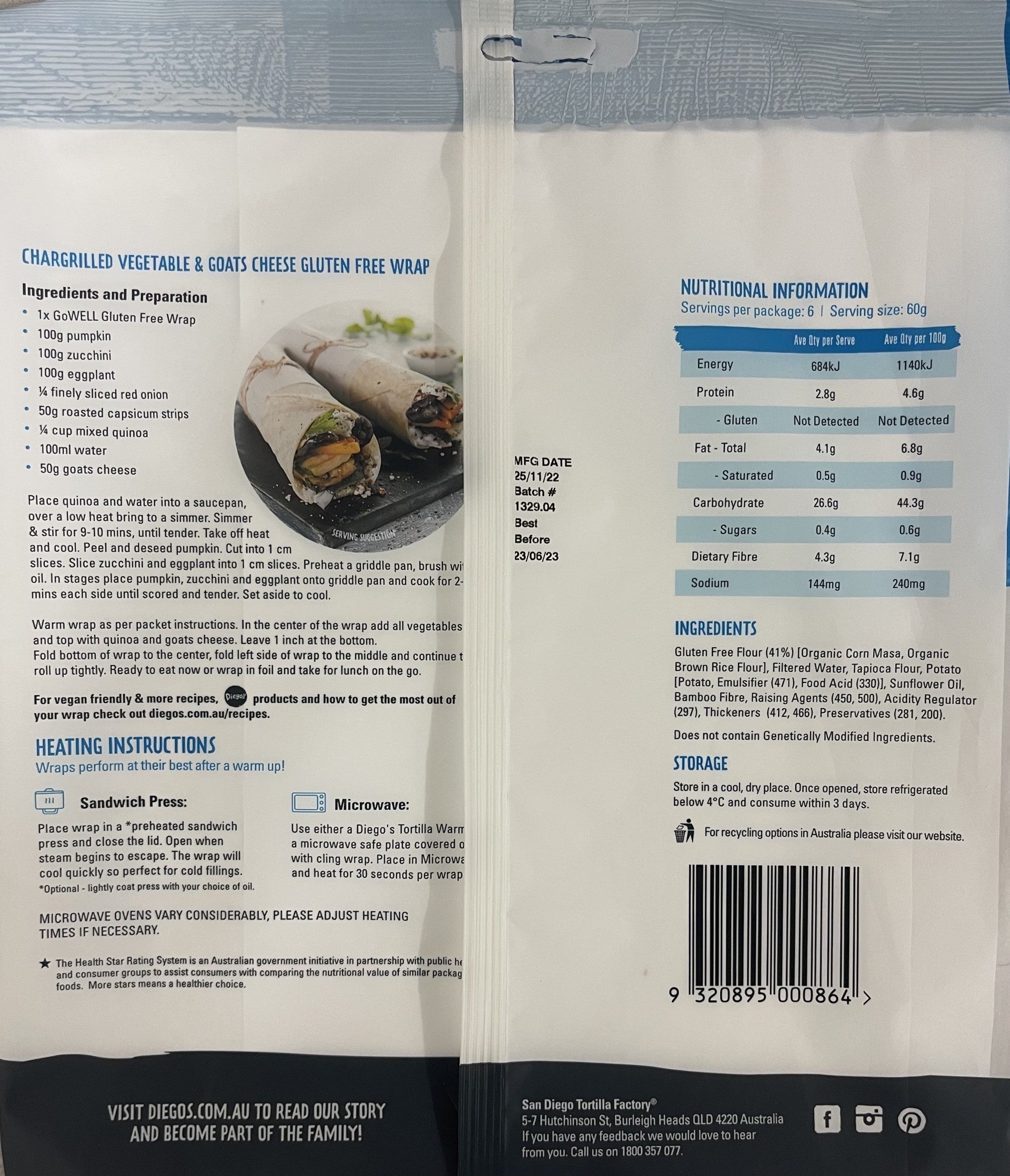 Diego's Gluten Free Wrap x6 360g: Enjoy delicious, gluten-free wraps packed with flavor and convenience. Perfect for quick and easy meals at home or on the go. Experience the taste without the gluten.