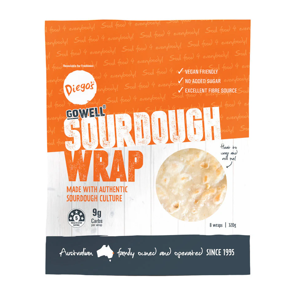 Diego's Sourdough Wrap x8 400g: Enjoy the perfect blend of tangy sourdough flavor and soft, chewy texture in every bite. Versatile and convenient, these wraps are ideal for creating delicious meals for the whole family. Elevate your dishes with Diego's Sourdough Wraps today!