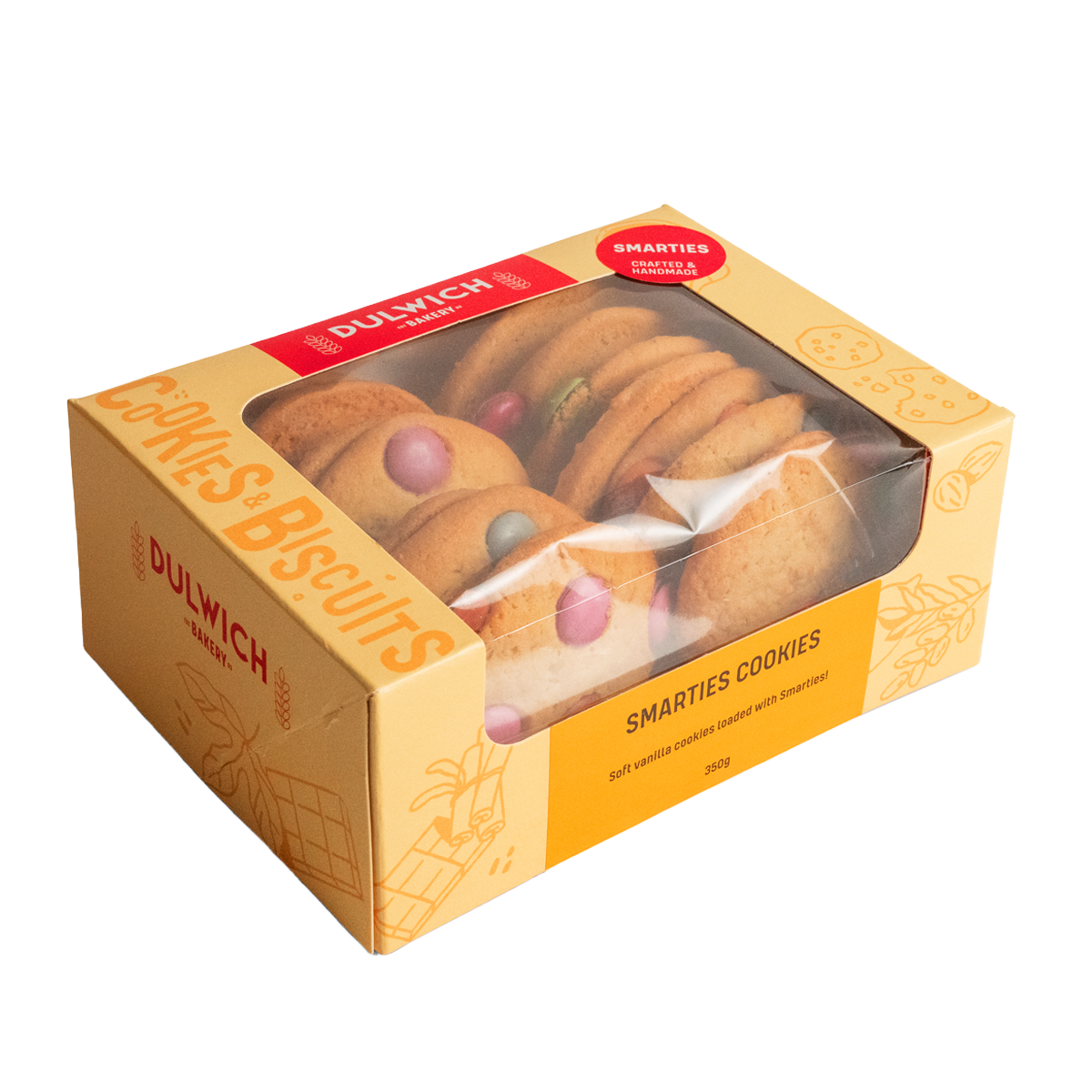 Indulge in the deliciously sweet and colorful Smartie Cookies from Dulwich Bakery. Each bite is a burst of chocolatey goodness, perfect for satisfying your sweet cravings. With 350g of irresistible cookies in every pack, treat yourself to a delightful snack that will brighten your day.