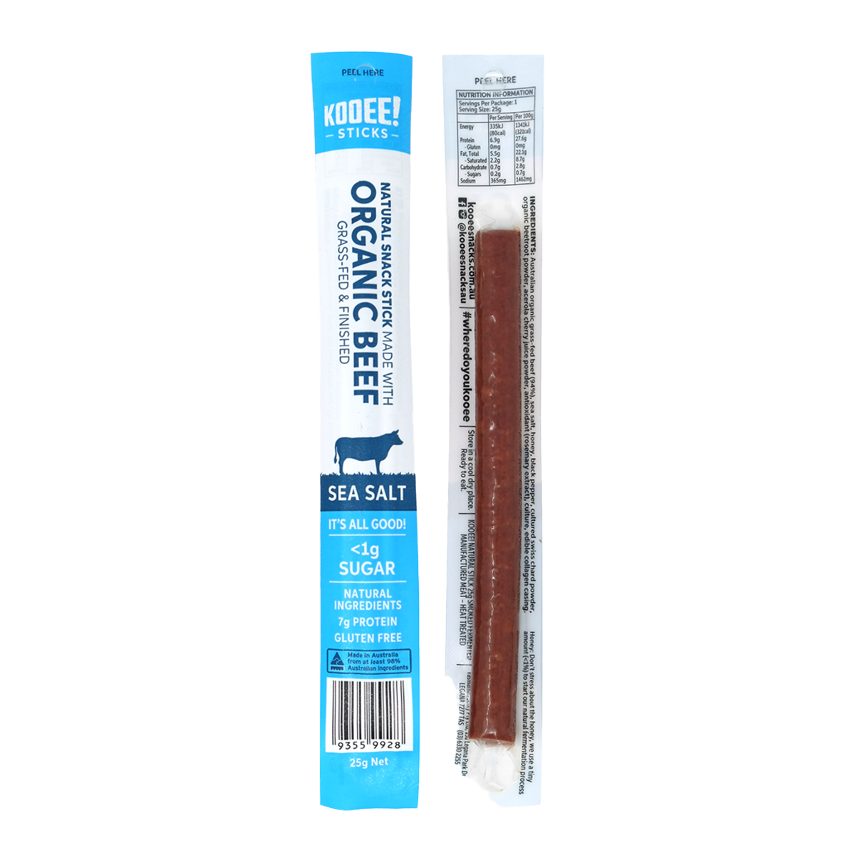 Kooee Organic Grass Fed Beef Stick Sea Salt 25g: Savor the rich, savory flavor of premium grass-fed beef with a hint of sea salt in every bite. Packed with protein and made with organic ingredients, this snack is perfect for fueling your day on-the-go. Enjoy a delicious and guilt-free snack that satisfies your cravings while supporting your health and well-being.