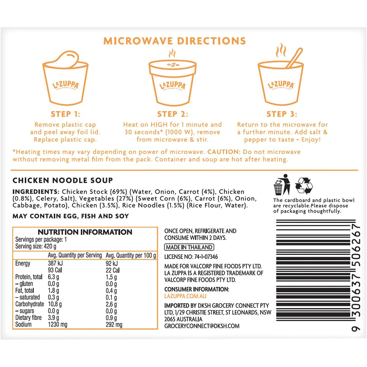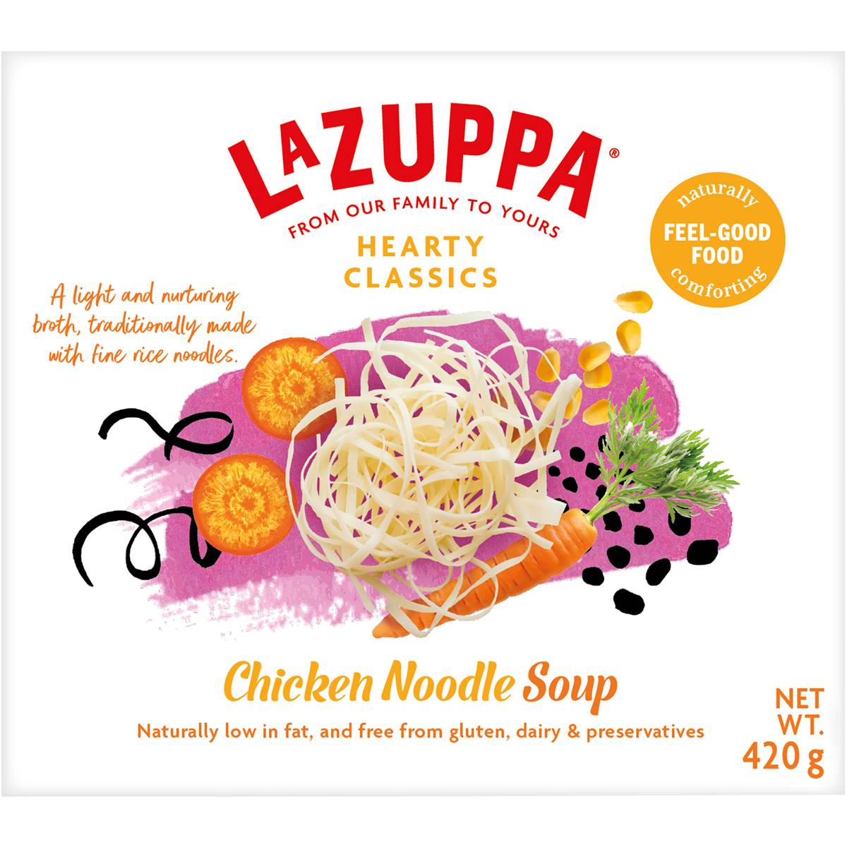 La Zuppa Chicken Noodle Soup 420g: Delicious and comforting soup packed with tender chicken and hearty noodles. Perfect for a quick and satisfying meal anytime. Enjoy the convenience and flavor of La Zuppa Chicken Noodle Soup today!