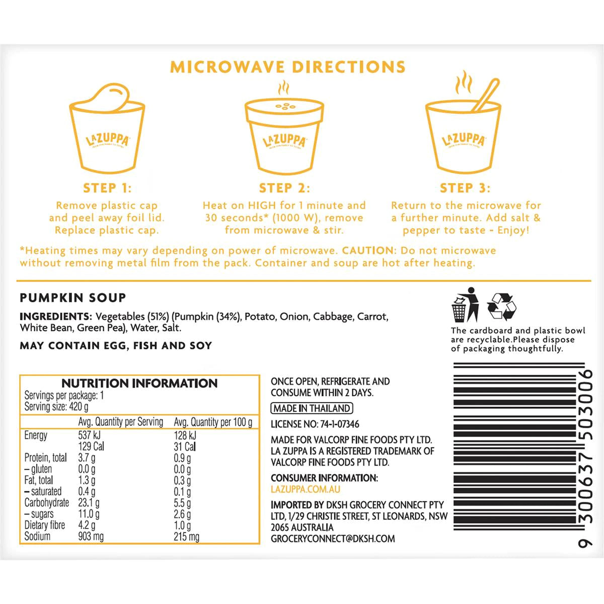 La Zuppa Pumpkin Soup 420g: Delicious, convenient, and ready in minutes. Enjoy the rich, creamy taste of pumpkin in every spoonful. Perfect for a quick and satisfying meal any time of the day.