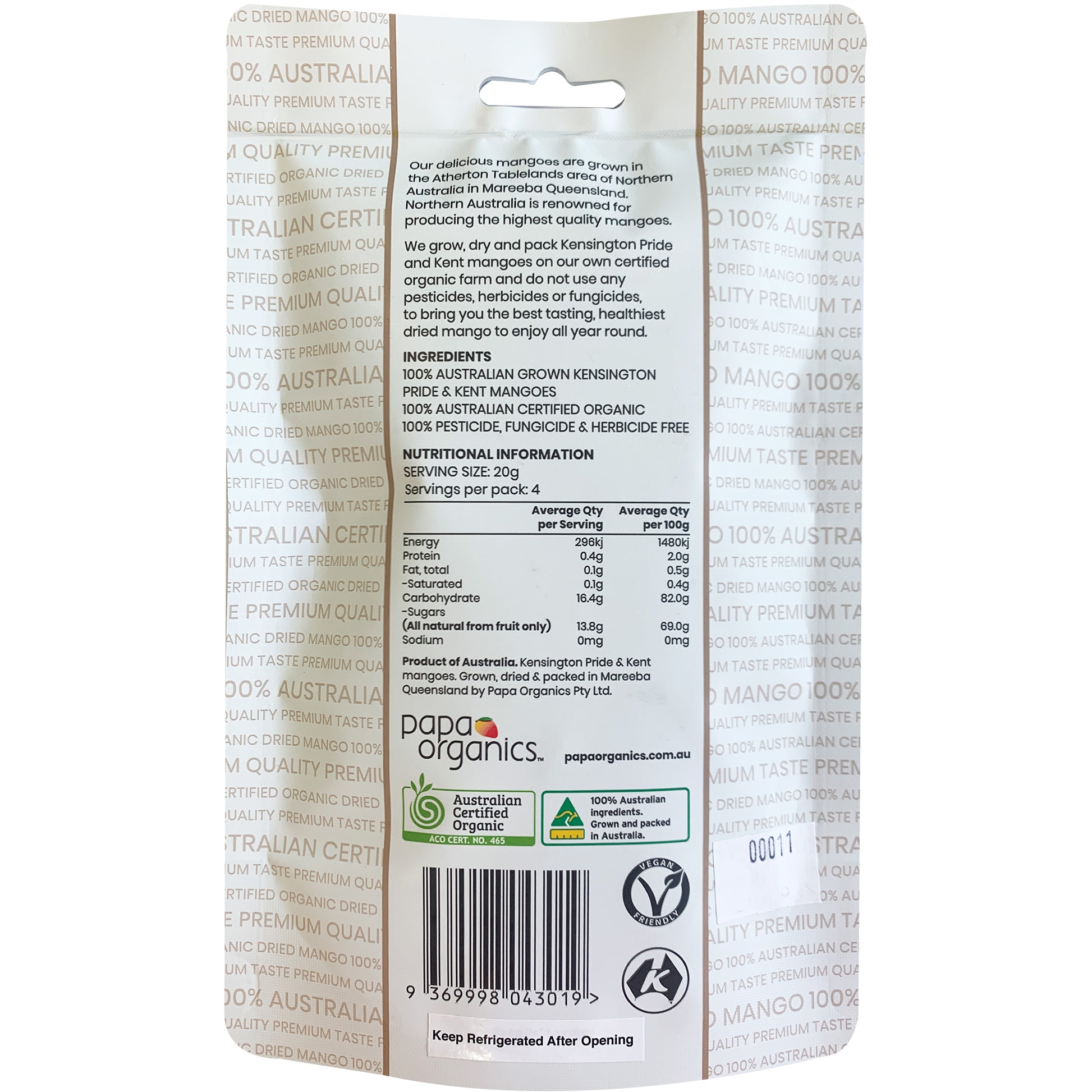 Papa Organics Dried Mango 80g: Enjoy the natural sweetness of premium organic mangoes anytime, anywhere. Packed with vitamins and antioxidants, our dried mangoes are a delicious and healthy snack for on-the-go energy. Experience the taste of pure goodness with every bite.