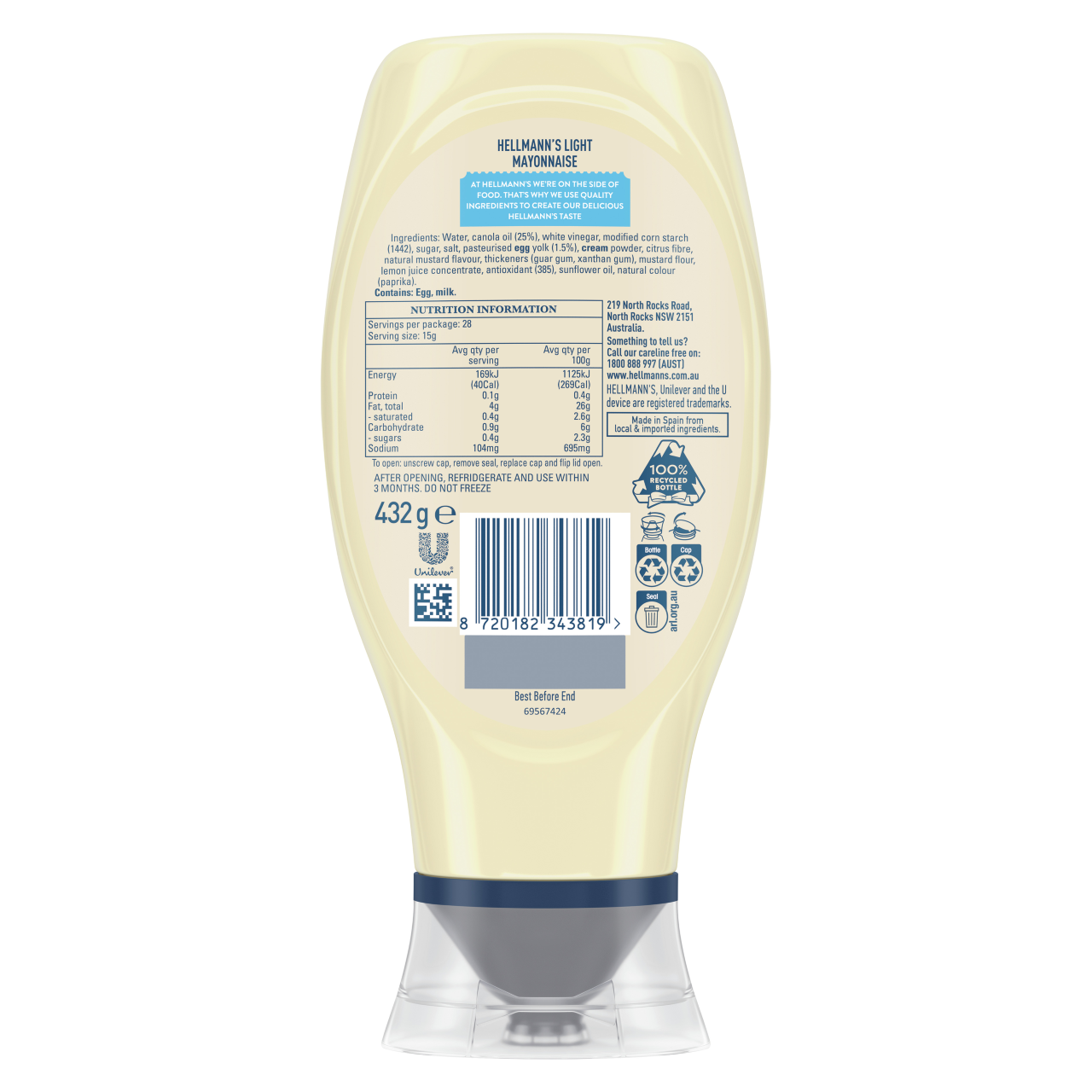 Hellmann's Light Mayonnaise Squeeze 432g is the perfect guilt-free condiment for your favorite dishes. With 60% less fat and calories than regular mayonnaise, this creamy and delicious spread allows you to enjoy the same great taste without compromising on flavor. Conveniently packaged in a squeeze bottle for easy application, it's a must-have for health-conscious food lovers looking to elevate their meals.
