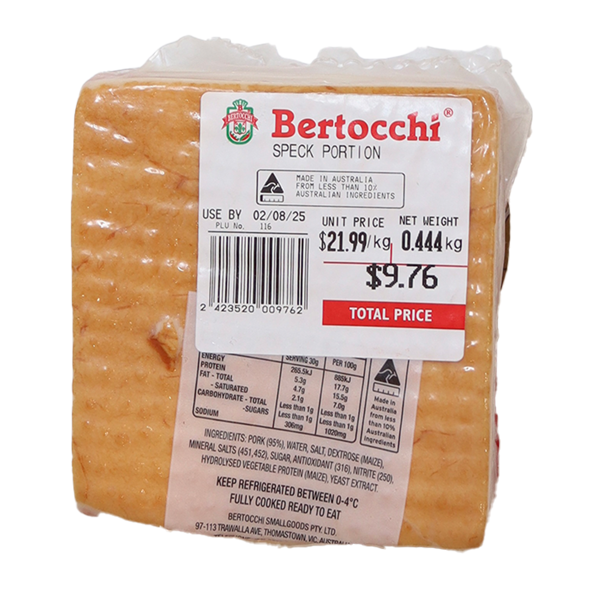 Bertocchi Smoked Speck 450-550g: Indulge in premium, smoky flavor with our authentic Italian speck. Perfect for adding a gourmet touch to your dishes. Order now for a delicious culinary experience!