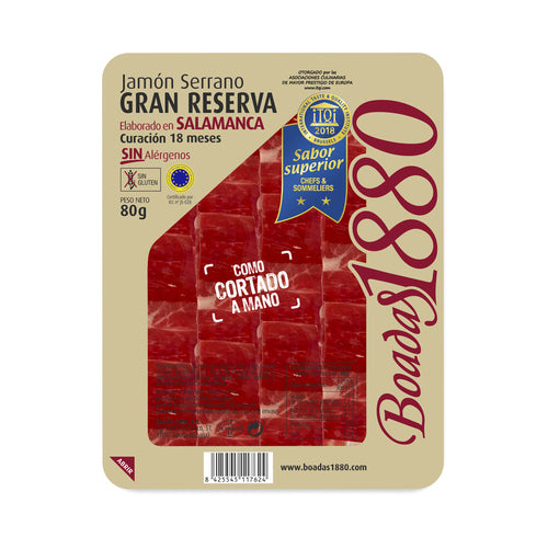 Boadas Serrano Ham Gran Reserva 80g offers a premium taste experience with its rich, savory flavor and melt-in-your-mouth texture. Indulge in this high-quality Spanish ham that is perfect for charcuterie boards, tapas, or as a gourmet snack. Elevate your culinary creations with Boadas Serrano Ham Gran Reserva 80g.