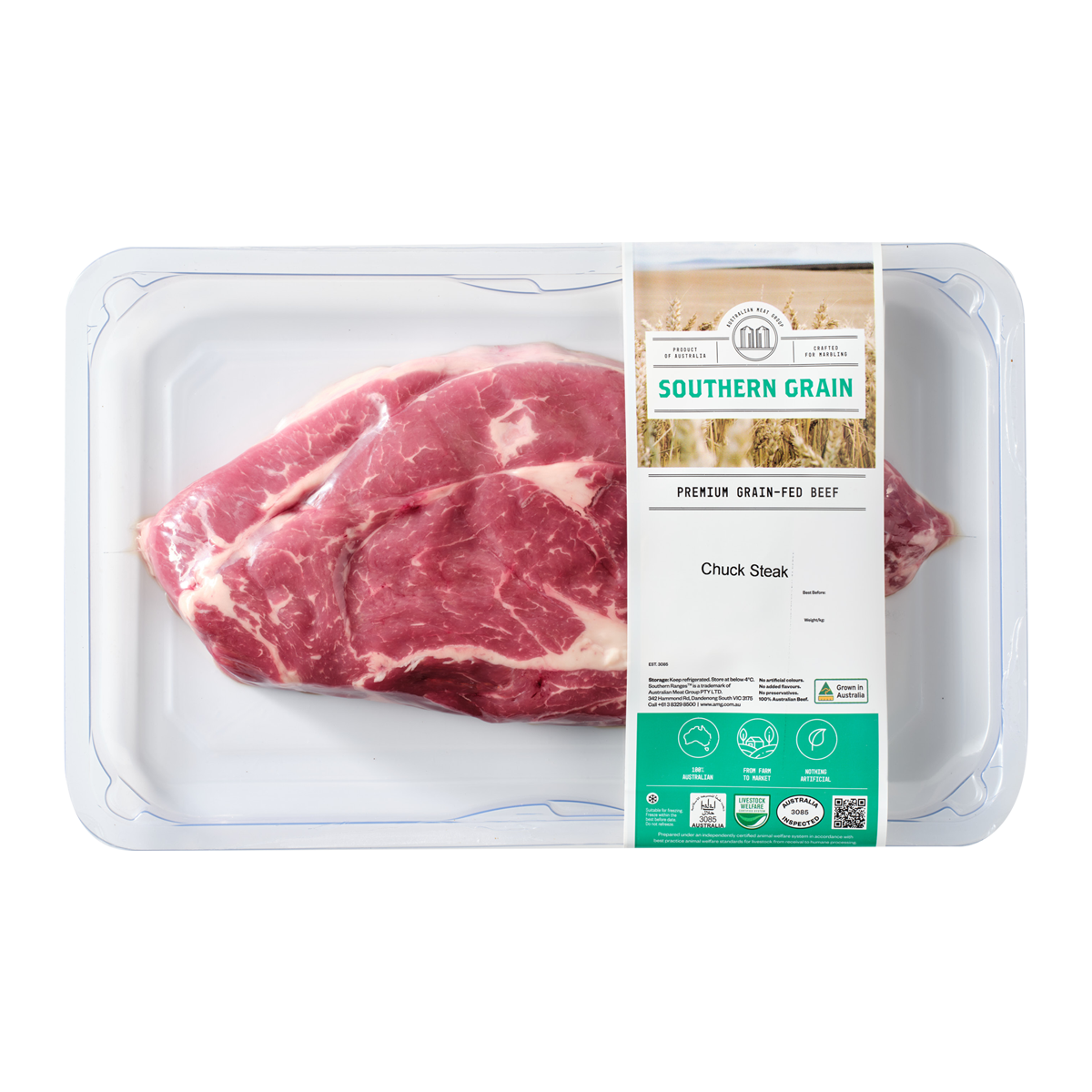 Southern Grain Premium Grain Fed Beef MB2 Beef Chuck Steak is a tender and flavorful cut perfect for grilling or pan-searing. Indulge in the rich marbling and juicy texture of this 300-600g steak, guaranteed to elevate your next meal to gourmet status.