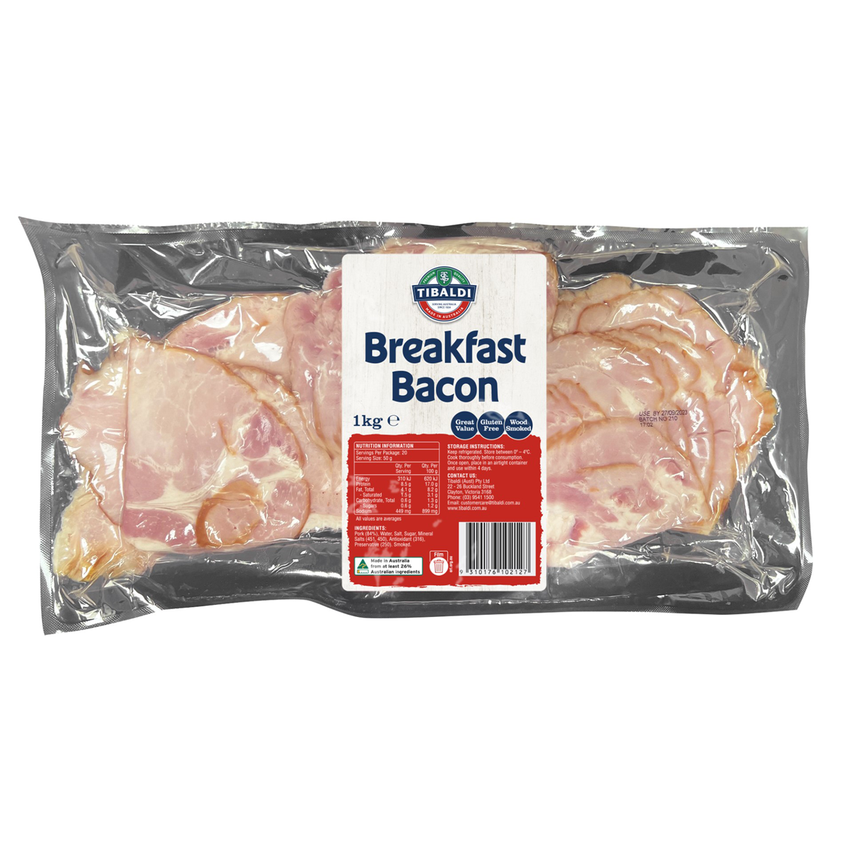 Tibaldi Breakfast Bacon 1kg: Indulge in premium quality, perfectly smoked bacon slices for a delicious start to your day. Enjoy convenience and superior taste with our thick-cut bacon, ideal for breakfast enthusiasts and culinary connoisseurs alike. Elevate your morning routine with Tibaldi Breakfast Bacon.