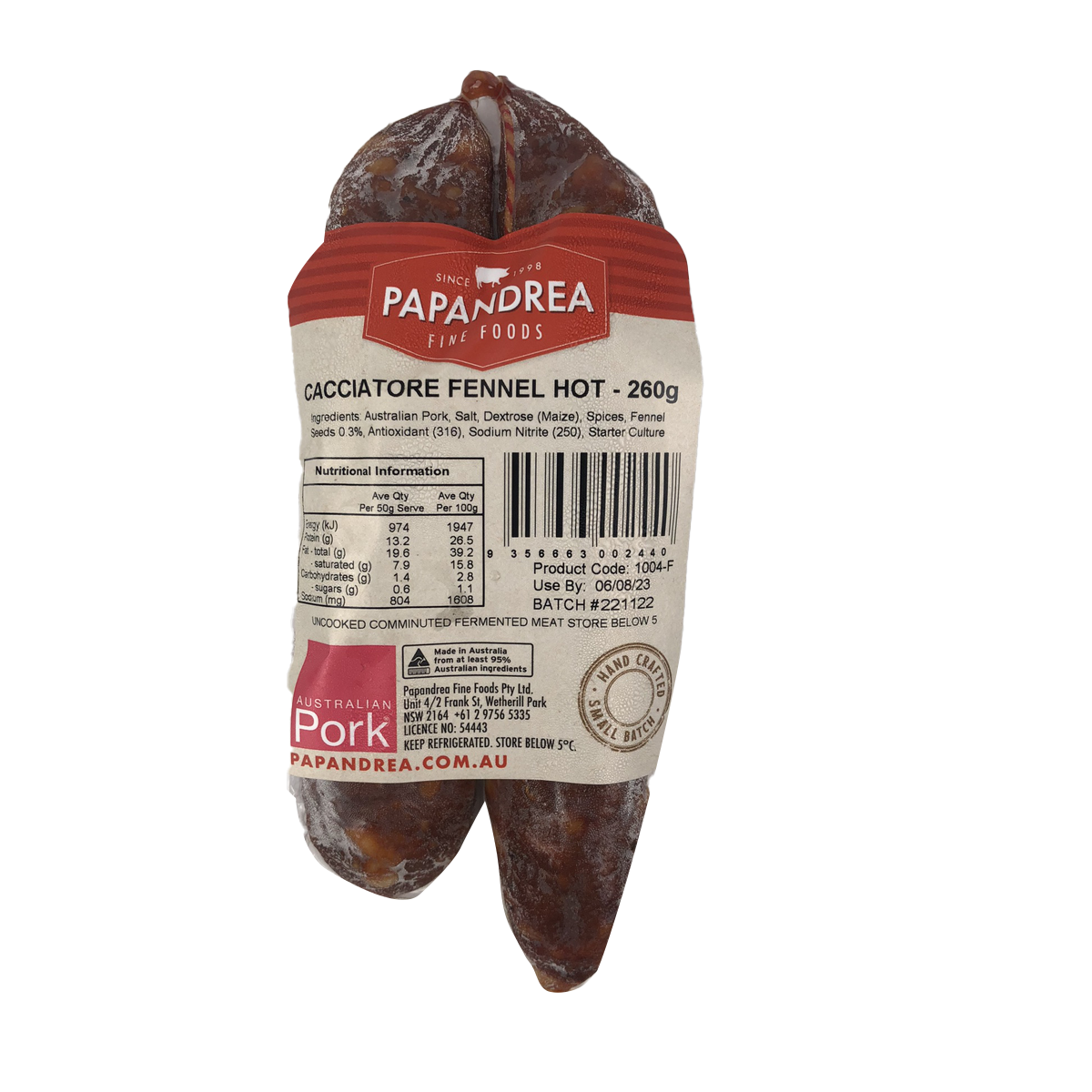 Papandrea Fine Foods Cacciatore Fennel Hot 260g offers a bold and spicy flavor experience, perfect for those who crave a kick in their charcuterie board. Handcrafted with premium ingredients, this artisanal salami is sure to elevate your snacking game.